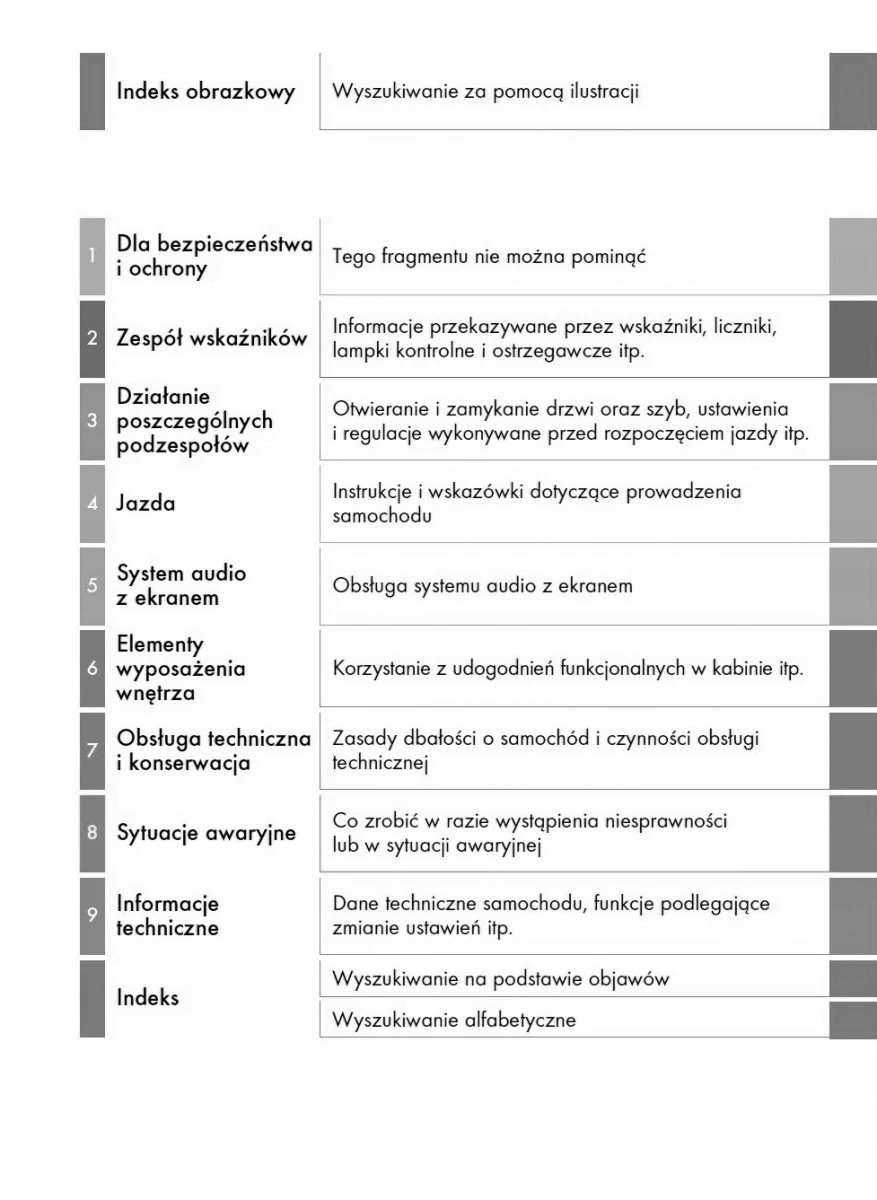 Руководство пользователя Lexus содержит все версии оборудования и полезную информацию о том, как эффективно и безопасно использовать автомобиль, например. - индикаторы, индикаторы открытия и закрытия - освещение и обзорность, сиденья, отсеки для хранения вещей, обогрев, вентиляция, кондиционирование - вождение, советы по эксплуатации, обслуживание автомобиля - уровни жидкостей, проверка и доливка, аварийные операции, замена колес, предохранители, замена лампочек - технические данные... и многое другое, дающее путешественникам ощущение безопасности и комфорта. Польское законодательство обязывает продавца приложить к автомобилю руководство по эксплуатации на польском языке. Руководство пользователя автомобиля новое, на польском языке.