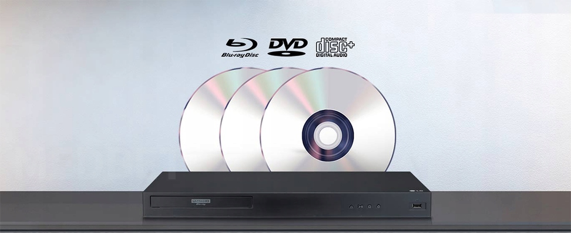 - Поддержка дисков 4K Blu-Ray, Blu-Ray 3D, Blu-Ray, DVD, CD