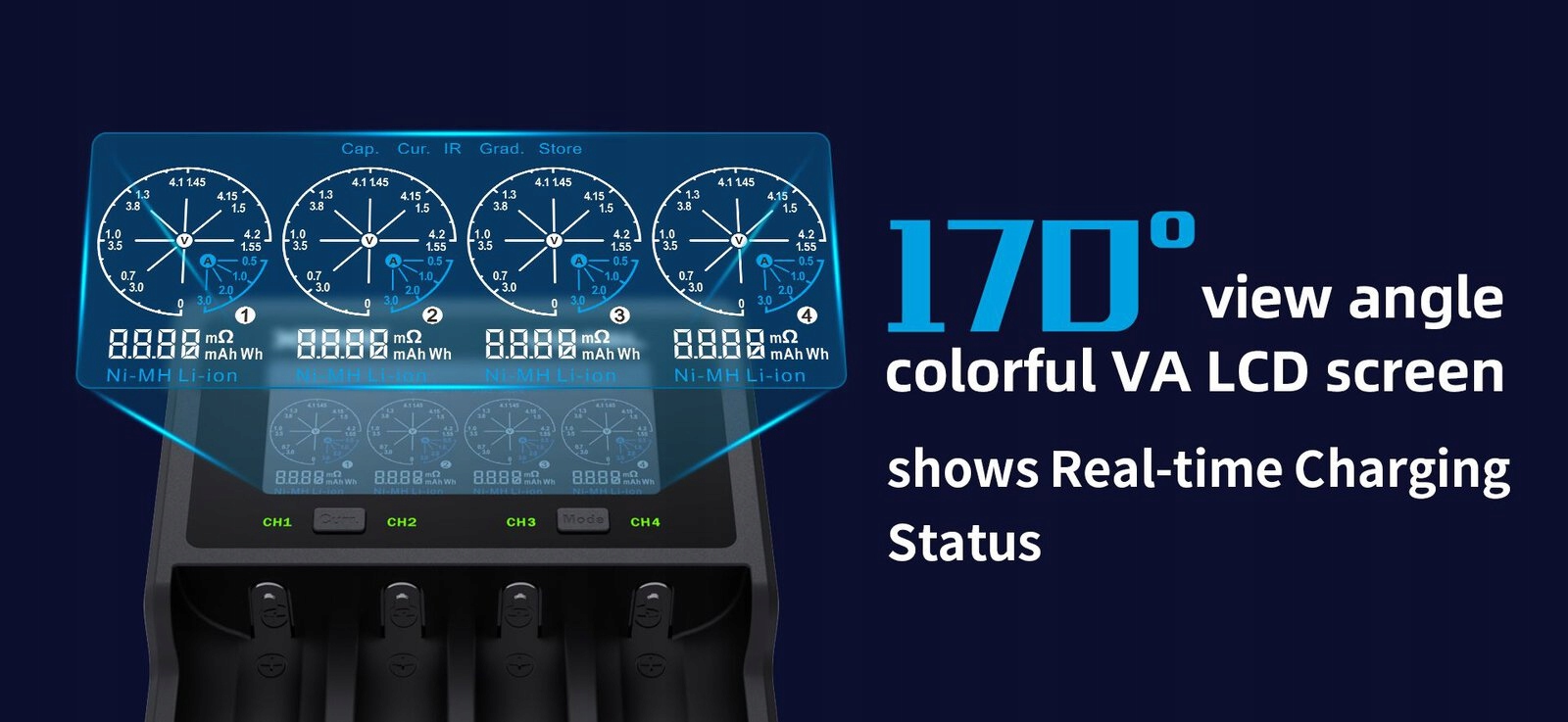 Цветной ЖК-дисплей VA предоставляет текущую информацию о зарядной емкости, выраженной в мАч, напряжении элемента, зарядном токе и внутреннем сопротивлении элемента. Вы можете контролировать процесс зарядки и разрядки аккумуляторов.