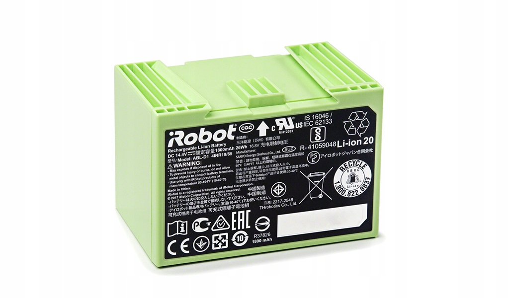 Литий-ионная батарея Irobot e/i имеет емкость 1800 мАч и состоит из 4 литиевых клеток. Благодаря этому он может обеспечить более длительные действия и большую силу пылесоса, что приводит к более точной очистке всей квартиры. Аккумулятор также зеленый, что позволяет легко распознавать и отличить от других аксессуаров.