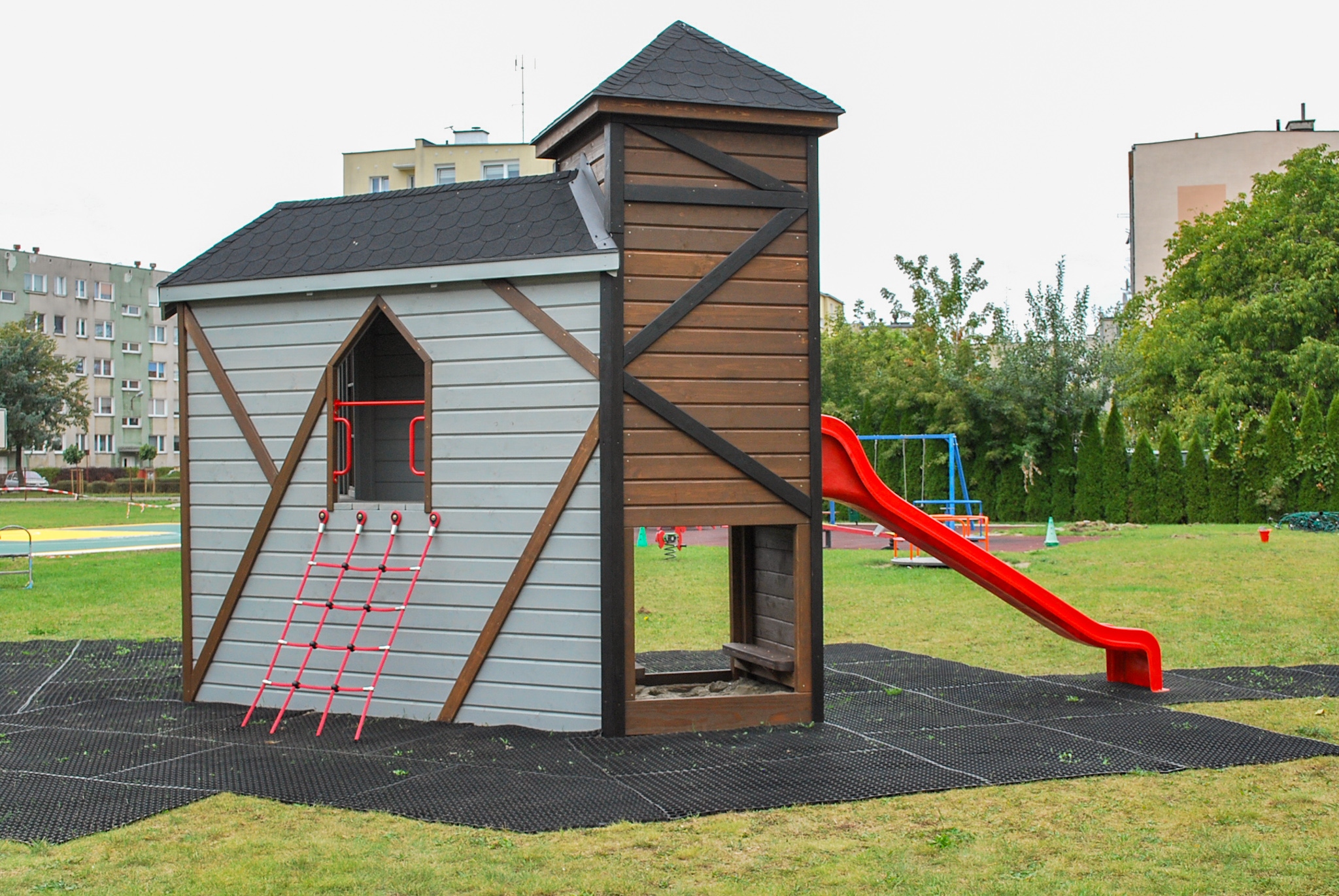 Деревянная игровая площадка в форме рыцарского замка – идеальное место для активного времяпрепровождения на свежем воздухе.