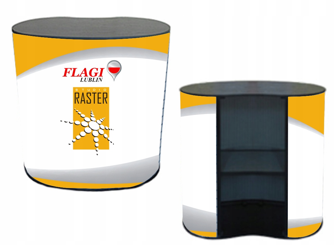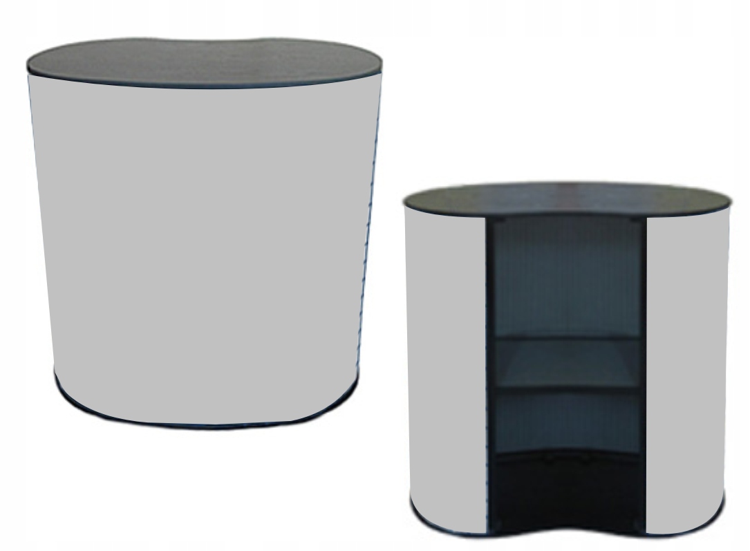 Она отличается чрезвычайно простой, легкой конструкцией и быстрой сборкой. Стенки стендов изготовлены из сотового ПВХ, к которому верх и основание крепятся с помощью липучки. Столешница изготовлена из плиты МДФ. Преимуществом стенда является полка (приобретается дополнительно), расположенная внутри, на которой можно спрятать различные используемые сейчас рекламные гаджеты.