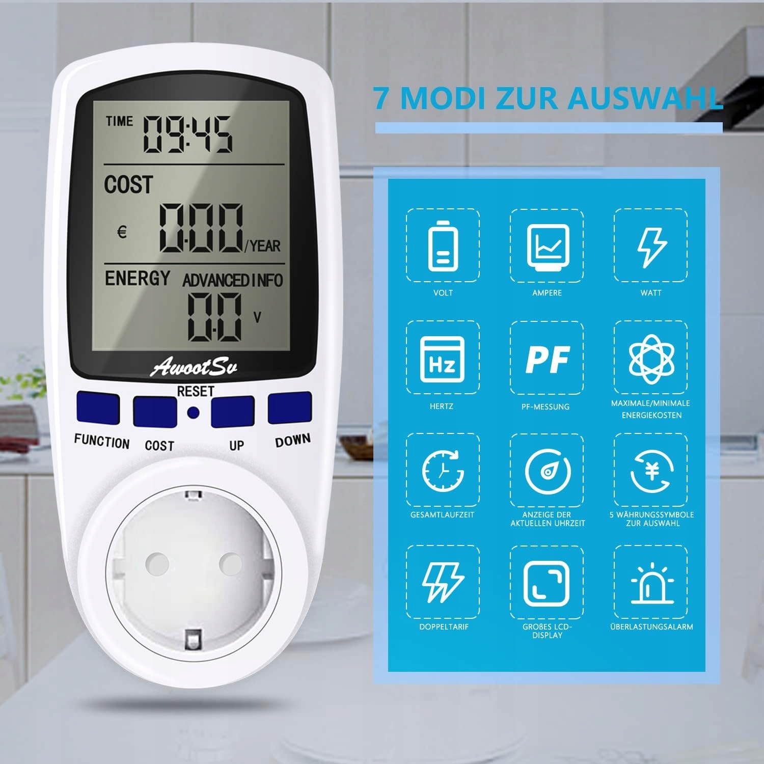 Многие функции: двойной тарифный розетка может измерить и отображать напряжение (v), ток (a), мощность (w), энергия (кВтч), частота (Гц), коэффициент мощности, стоимость, максимальная мощность и т. Д.