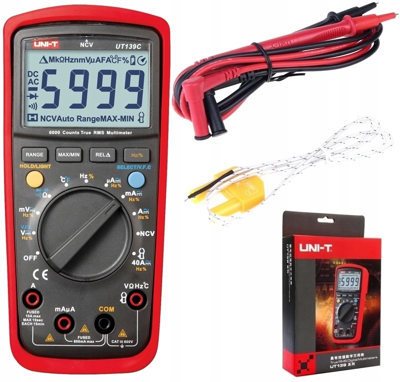 ИЗМЕРИТЕЛЬ UT139C — уникальное устройство, которое, помимо высокого разрешения, предлагает также несколько других функций, заслуживающих внимания, например, измерение ИСТИННЫХ среднеквадратичных значений в диапазоне до 45 Гц-1 кГц (до 400 Гц с помощью включен фильтр VFC), также измерение высокой емкости до 99,9 мФ (99999 мкФ), измерение коэффициента заполнения в диапазоне 0,1%-99,9% и другие. Измерение мкА-мА также в диапазонах переменного тока не является общепринятой функцией. Функция Rel полезна, например, при измерении конденсаторов небольшой емкости, когда она может устранить смещение, вызванное паразитной емкостью подключенных кабелей. Также может оказаться полезным термометр (зонд К). UT139C можно использовать в качестве бесконтактного тестера переменного напряжения (NCV), показывающего близость переменного напряжения >100 В в четыре этапа. Индикацию обеспечивает красный светодиод в верхней части дисплея, сам дисплей (-,--,---,----) и звуковой сигнал.