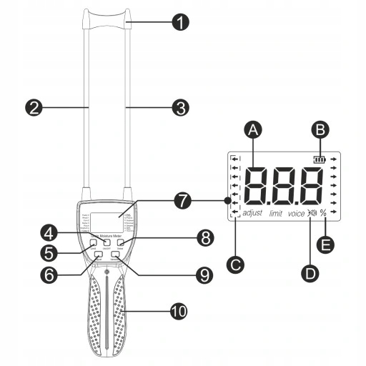 1. Защитное наложение (защищает от деформации). Измерительный электрод изготовлен из нержавеющей стали. Измерительный электрод изготовлен из нержавеющей стали. Кнопка питания. Кнопка настройки ограничения. Кнопка регулировки значения. ЖК -дисплей