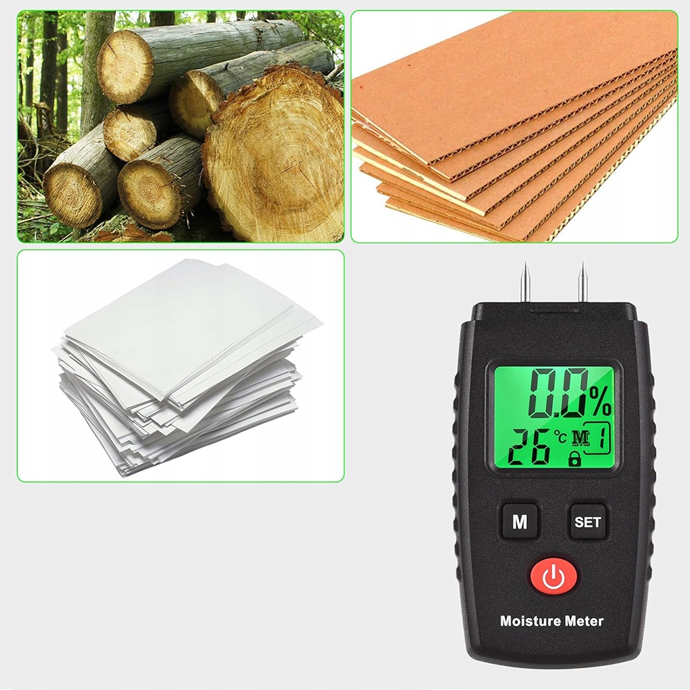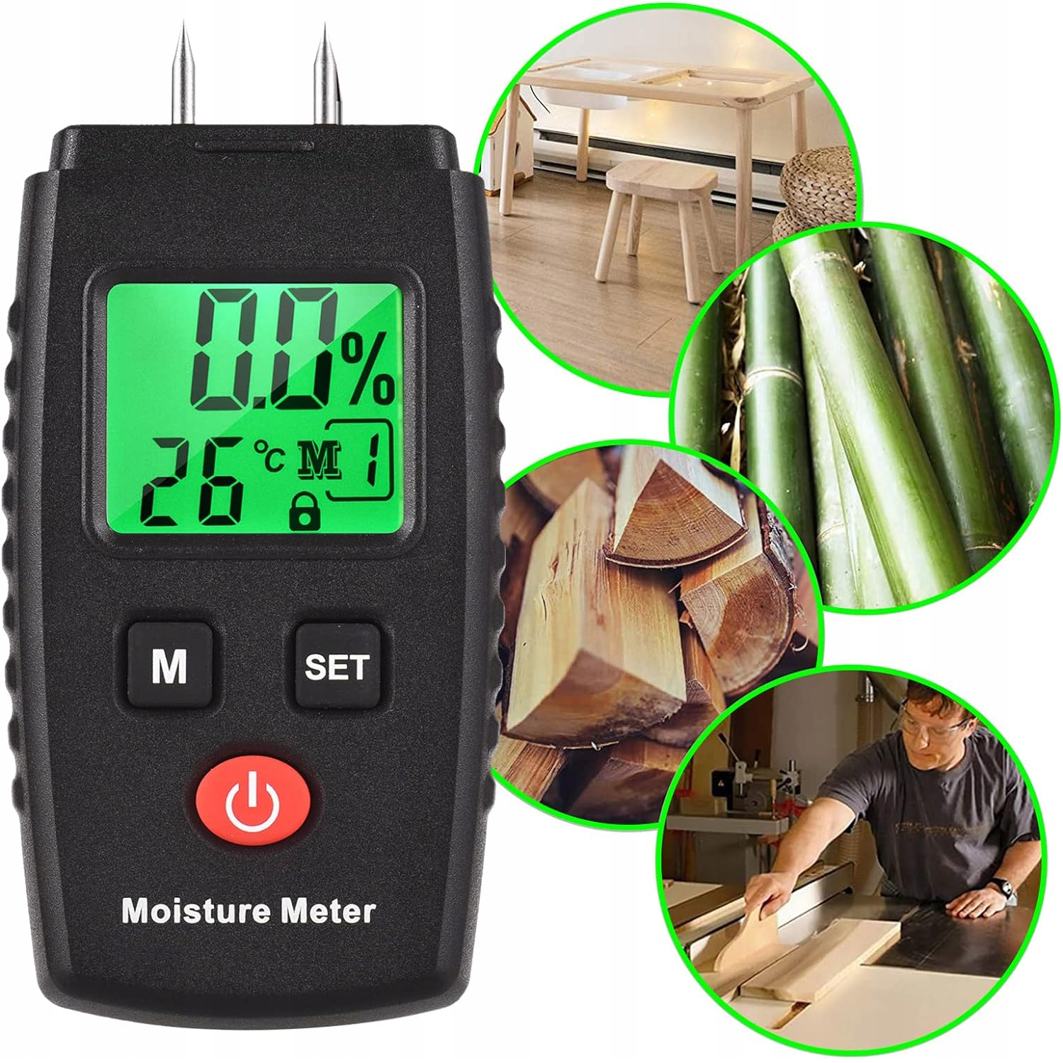 - ✔paktowe и прочное измерительное устройство для быстрого определения влажности, например, В топливной древесине, пиломарке, Дерево, посуды, шпоне, а также для бумаги, лекарственных растений, бамбука и других материалов.