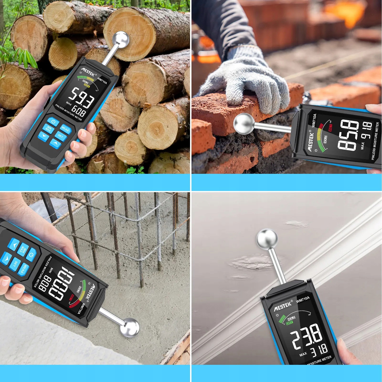 💧 Оборудован 3-дюймовым цветным экраном HD с тремя красочными аналоговыми полосками, демонстрируя сухие, рискованные и влажные зеленые, желтые и красные, что очень красиво и интуитивно понятно, а также очень легко читать при слабом освещении. Строительство, такая как гипсовая, сланцевая, плитка, картон, штукатурка, бетон и раствор, а также для ремонта утечек воды, проверка содержания влаги в стенах спальни, напольных плиток или лагеря и т. Д.