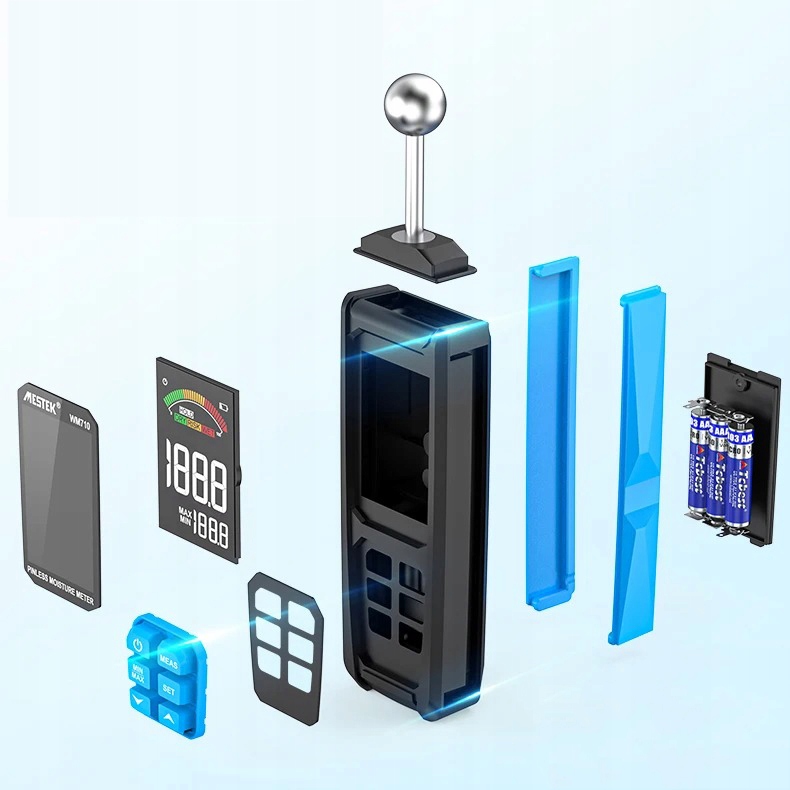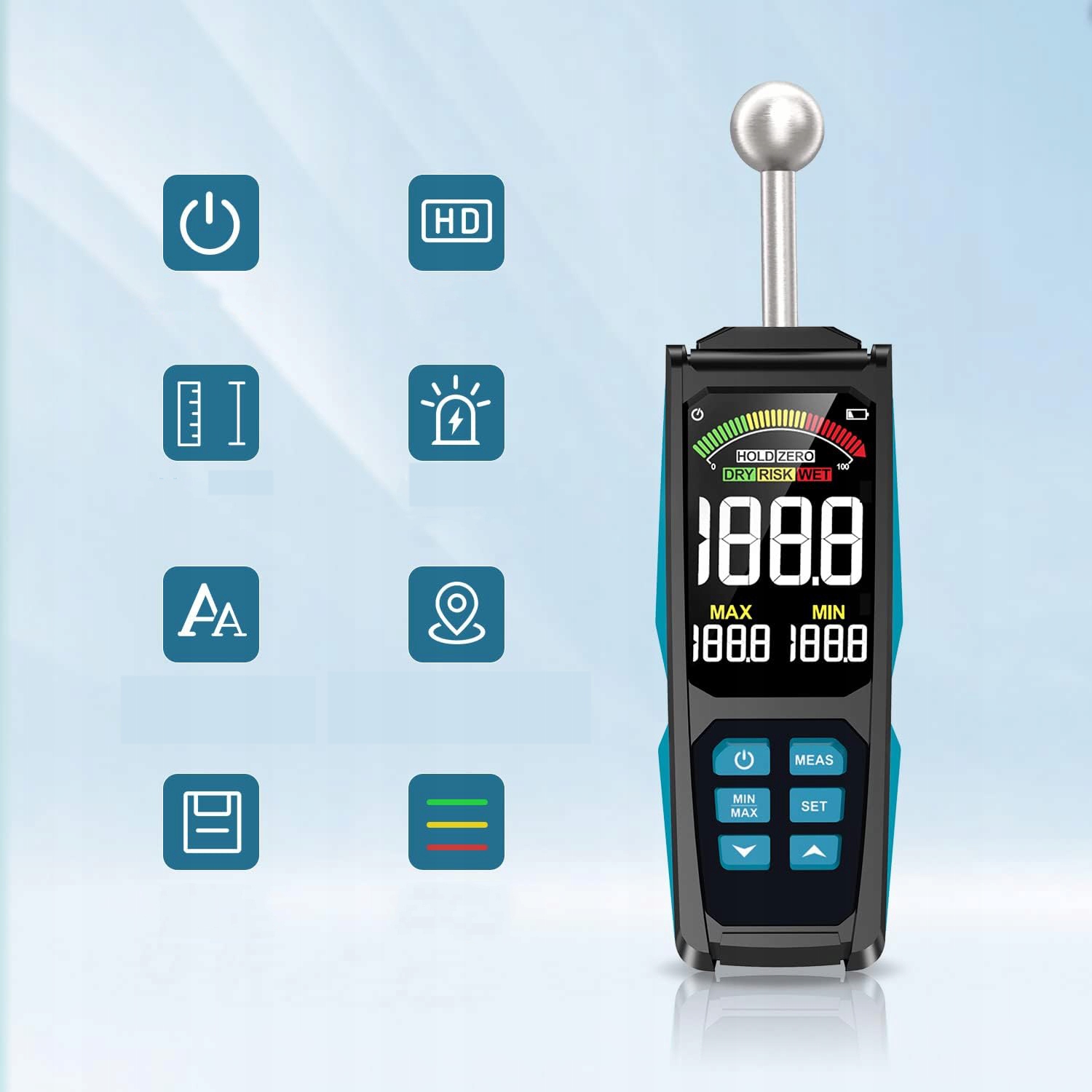 💧-a-aeabing eogners аккумулятор, измеритель влажности автоматически отключается в течение 30 минут после включения. Нажмите и удерживайте кнопку «Измерение» при отключении, чтобы отменить эту функцию.