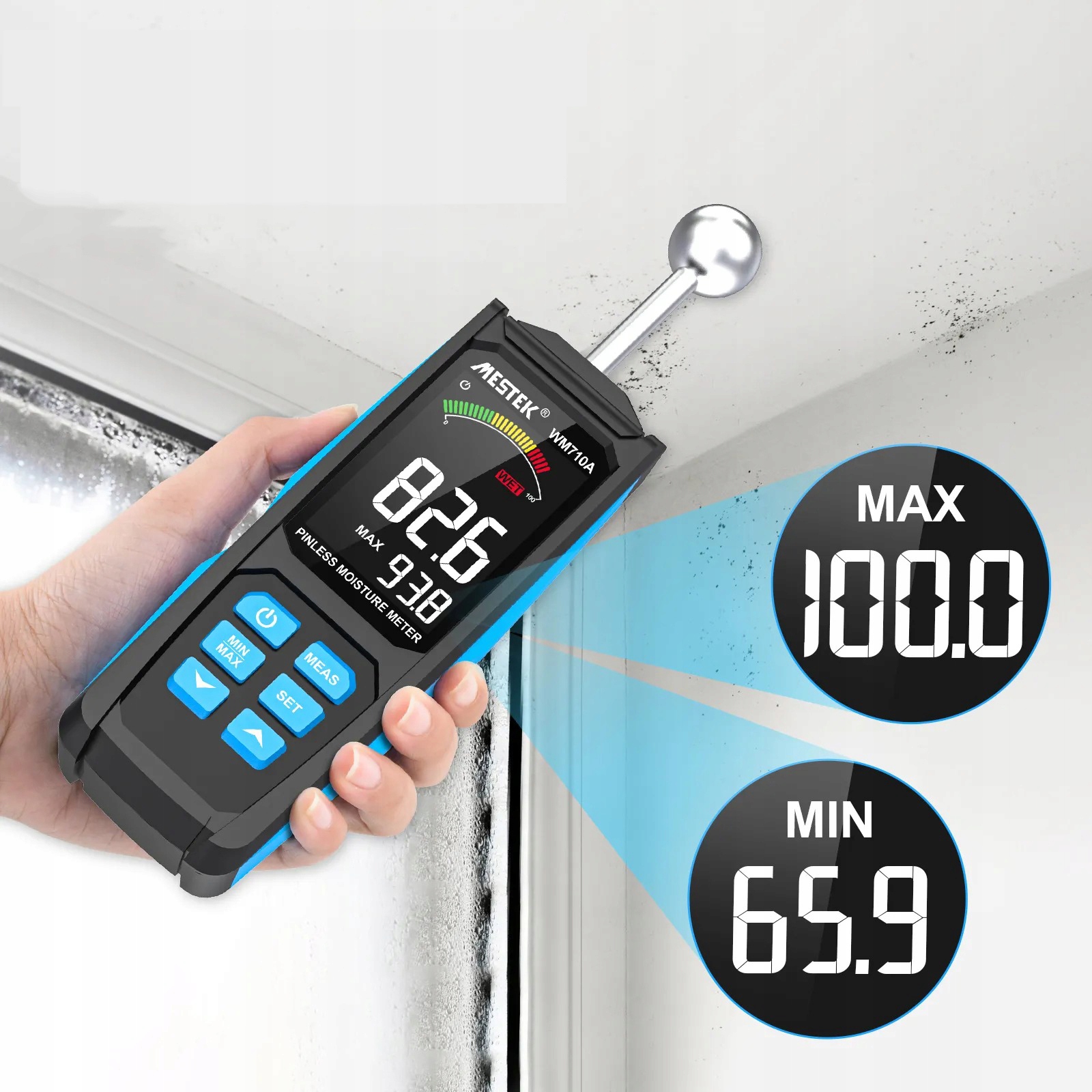 💧-высокие частотные волны могут проникать на глубину около 40 мм и не повредить поверхность объекта. Легко измерить уровень влаги в углах, неровных поверхностях и плинтусе.