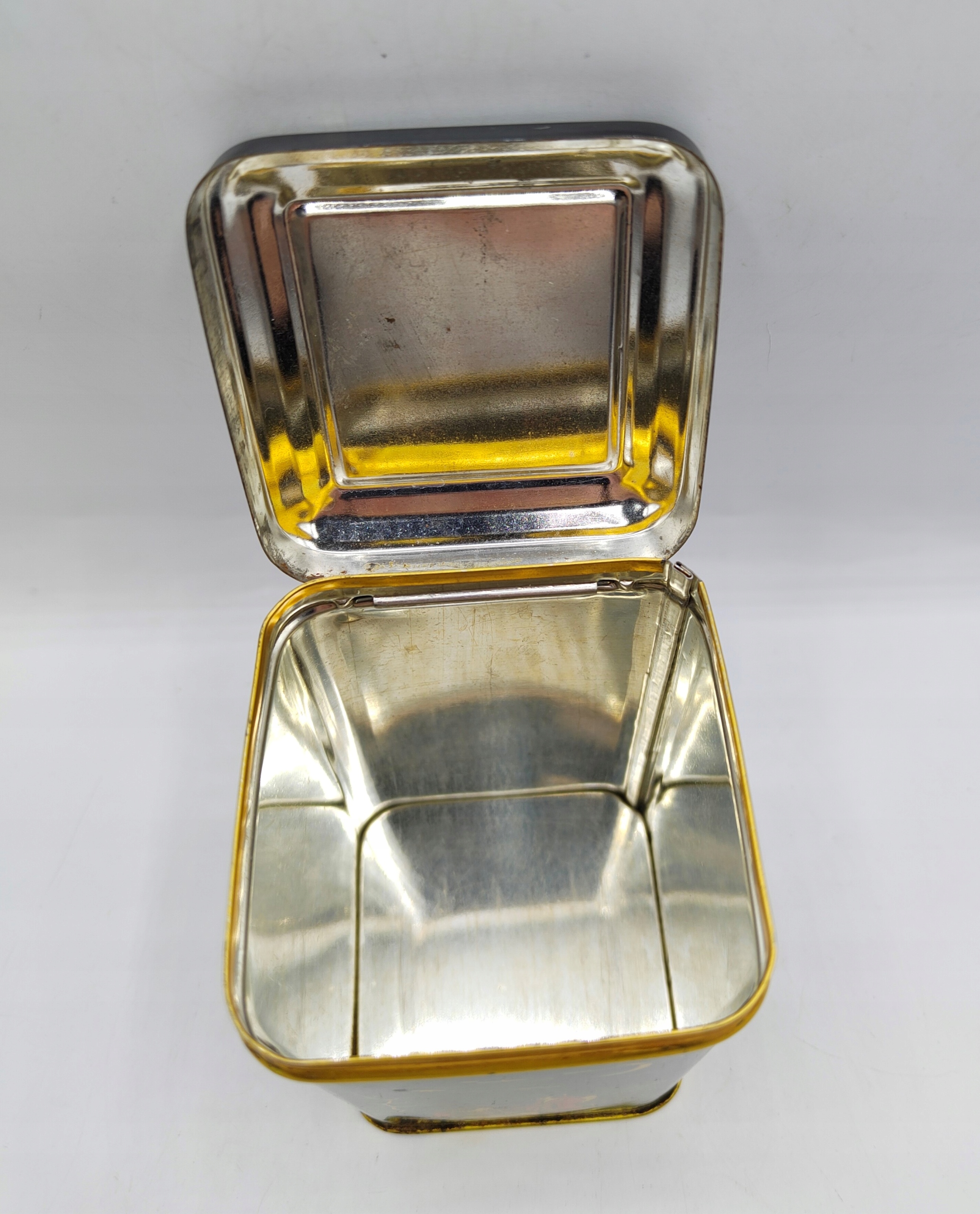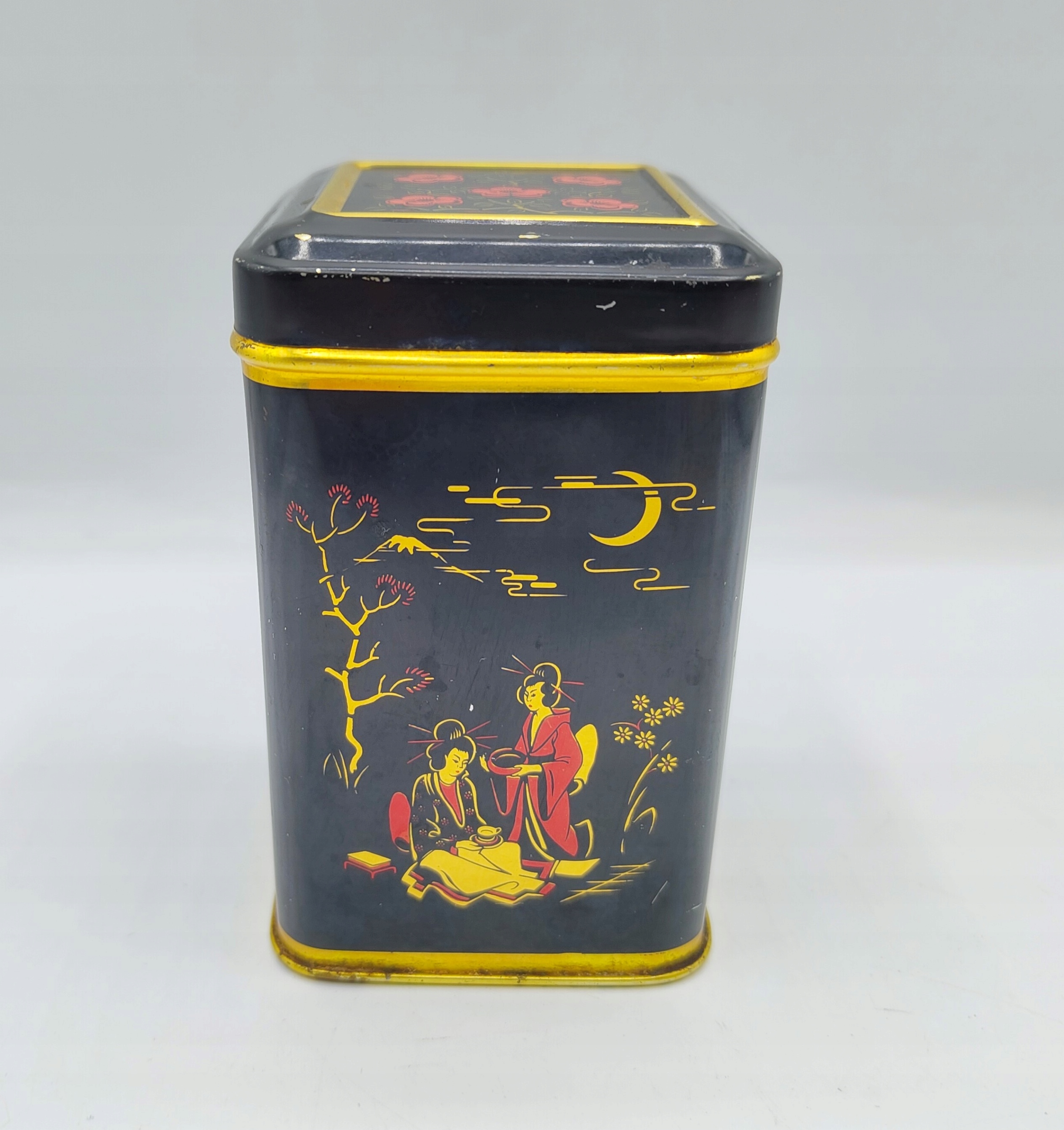 śliczna STARA puszka, kwiat wiśni, gejsze i czaple