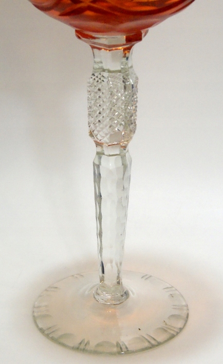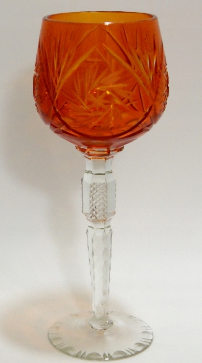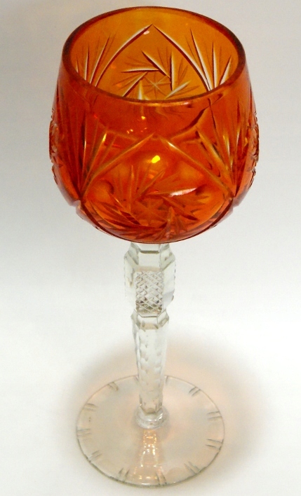 Красивый, старинный бокал для вина - ремер, выполнен из оранжевого и бесцветного многослойного хрусталя, стекло старое, есть небольшие дефекты, пузырьки воздуха, декор украшен срезом, старый бокал красивый.