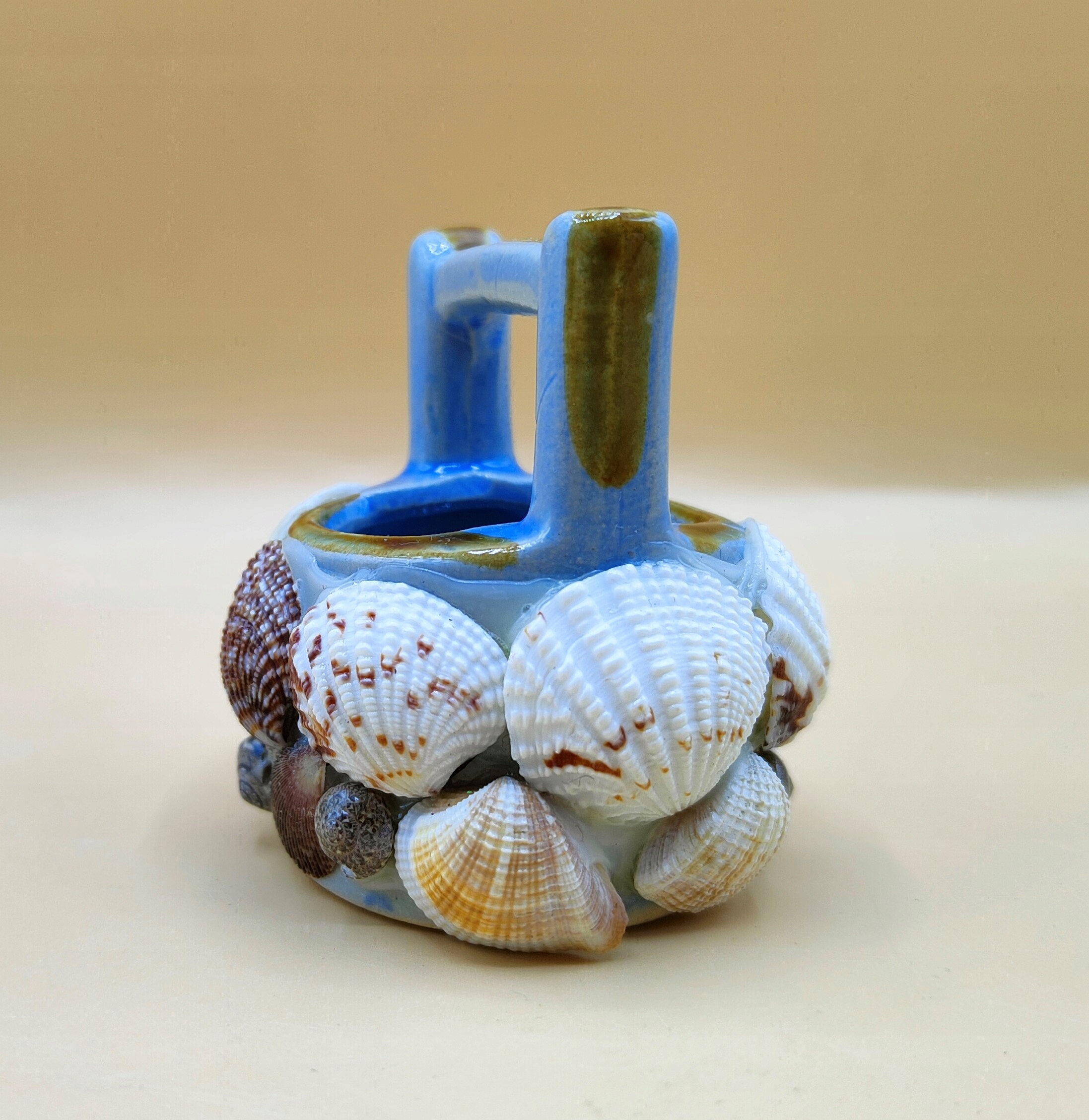 Изготовлено из керамики, покрыто с настоящими ракушками. Высота: 6,4 см, диаметр 5,7 см. Вес примерно 90г. Очень хороший предмет. Никаких скрытых дефектов нет, фотографии очень точные. В жизни тоже выглядит красиво.