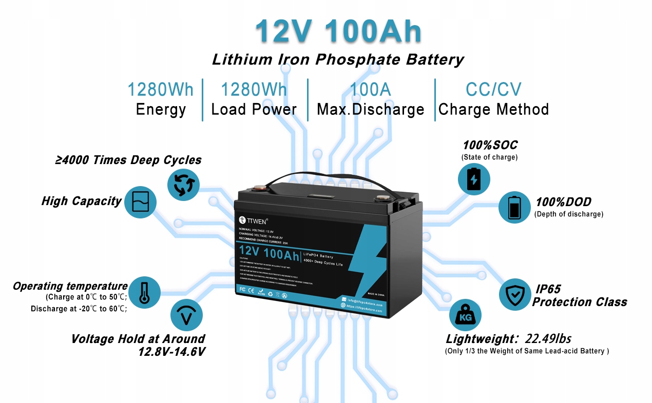 Аккумулятор TTWEN LIFEPO4 имеет функцию BMS (система управления аккумулятором) на 100 А, которая защищает от перегрузки, разрядки, тока и коротких замыканий с коэффициентом самопокрытия. Встраивается перед применением при температуре, предотвращающей зарядку при температуре выше 122°F (50°C). Нет памяти, сразу после зарядки. Аккумулятор Lanpwr Lifepo4 имеет степень защиты IP65.