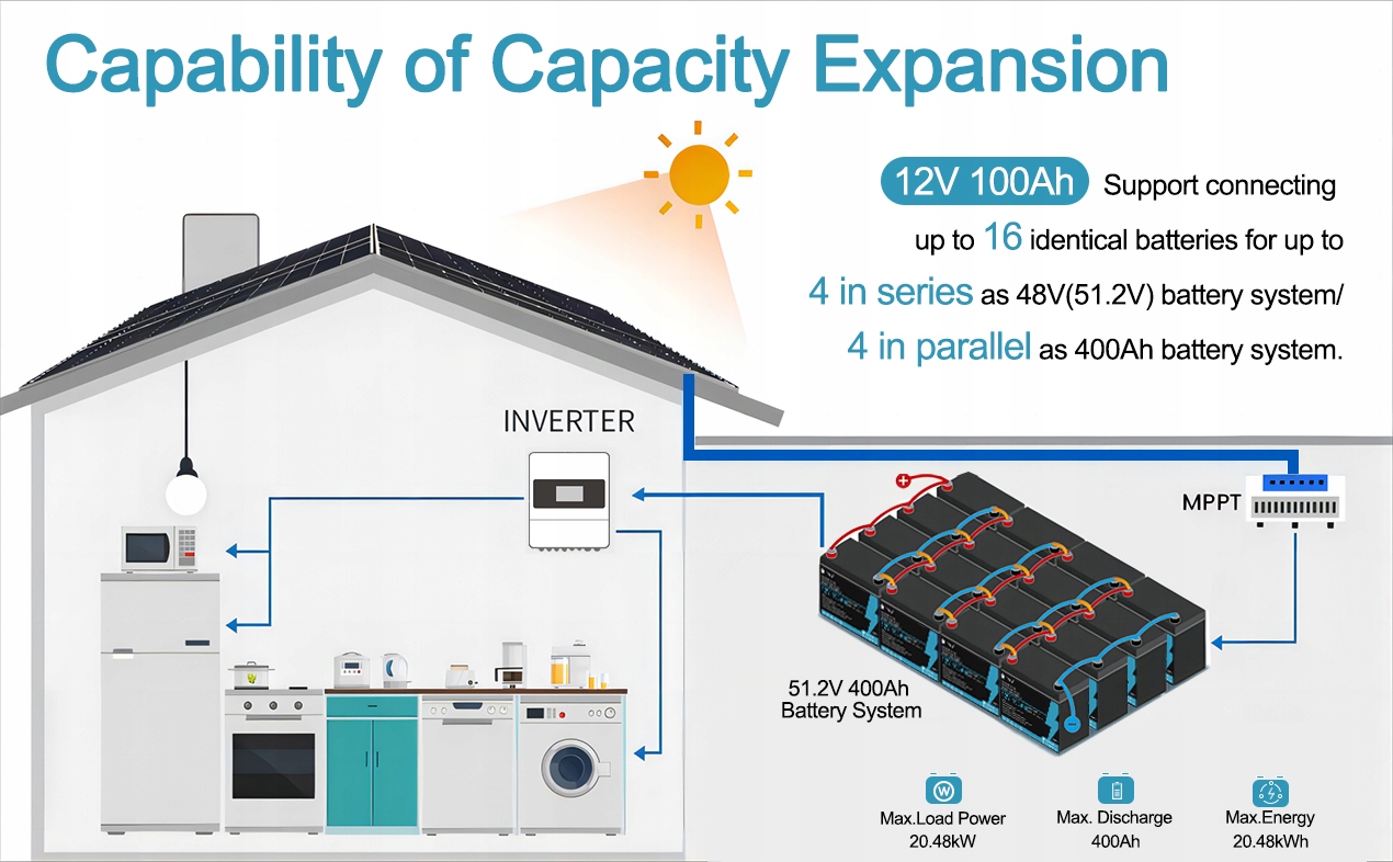 Аккумулятор TTWEN LIFEPO4 можно устанавливать последовательно , получая более высокую емкость и напряжение. Максимальное последовательное подключение: до 4-х одинаковых аккумуляторов или розеток до 48В последовательно. Подключение: можно подключить несколько батарей, контролируется не более 4 штук. Возможность расширения до 4 серий и 4 (макс. 4S4P) для увеличения объема (макс. 400 Ач) и базового предела (24 В, 36 В, 48 В). В случае подключенных или последовательно соединенных батарей они должны быть одинаковыми и доставлены в будущем (в течение 3 месяцев).