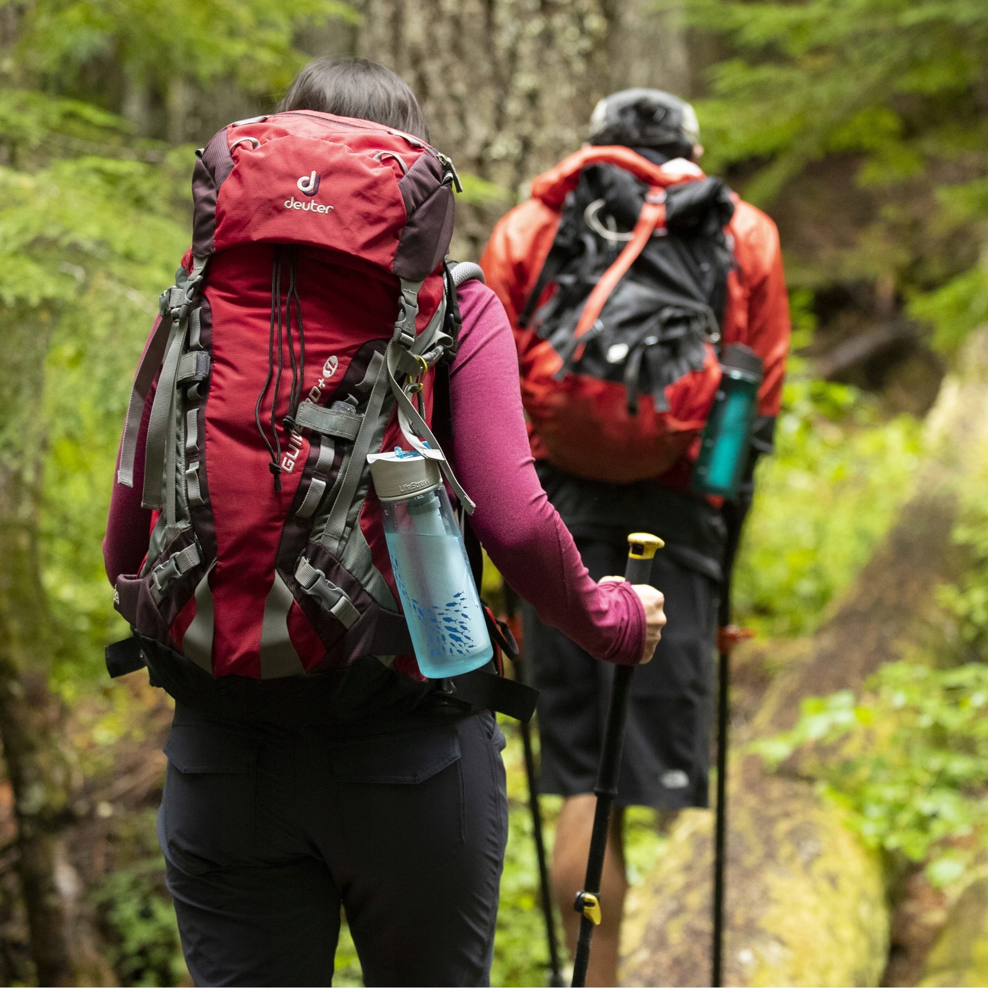 В комплект входят:бутылка для воды, мембранный микрофильтр, фильтр с активированным углем, колпачок с силиконовым мундштуком, карабин.