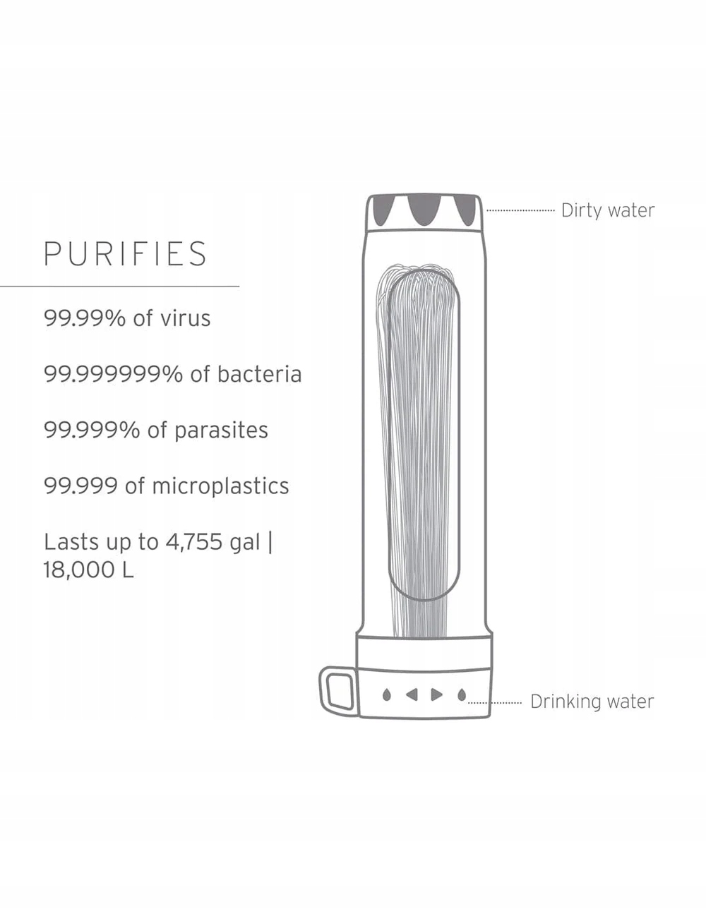 - Удаляет 99,999999% обитающих в воде бактерий (включая кишечную палочку, сальмонеллу), 99,99% вирусов, 99,999% паразитов (включая лямблии и криптоспоридии) и 99,999% микропластика, грязи, ила, песка и мутности.
