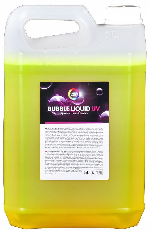 LIGHT4ME BUBBLE FLUID UV 5л - это профессиональная, без запаха и очень эффективная УФ-жидкость для машин для создания мыльных пузырей на основе чистого смесь воды и неионогенных поверхностно-активных веществ. Решение широко используется, особенно в индустрии развлечений.