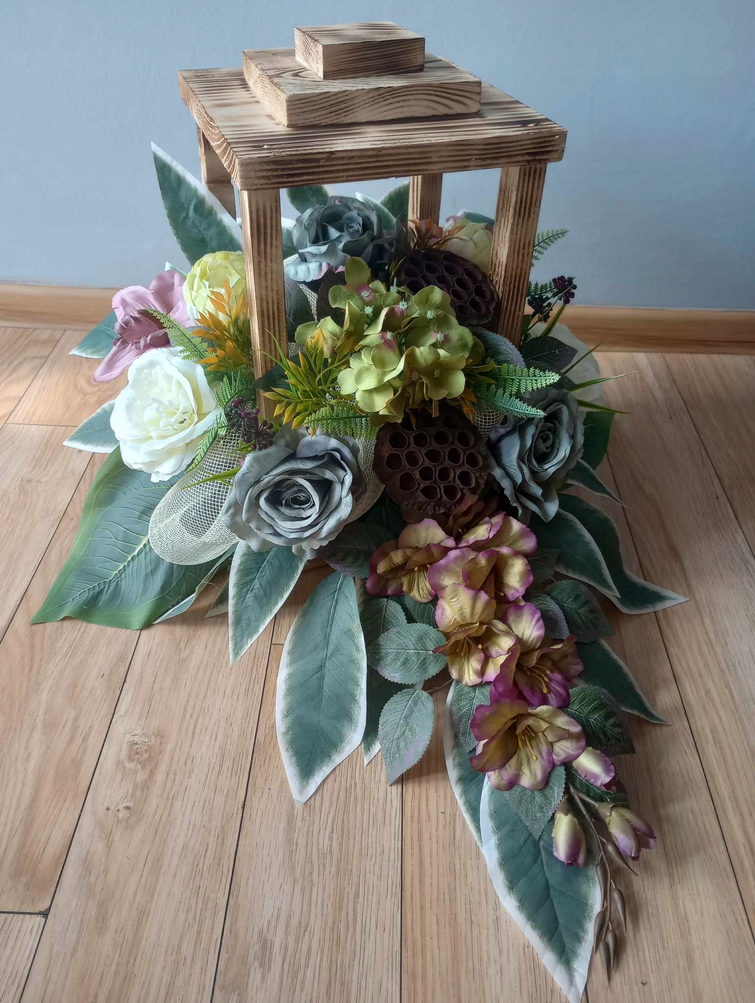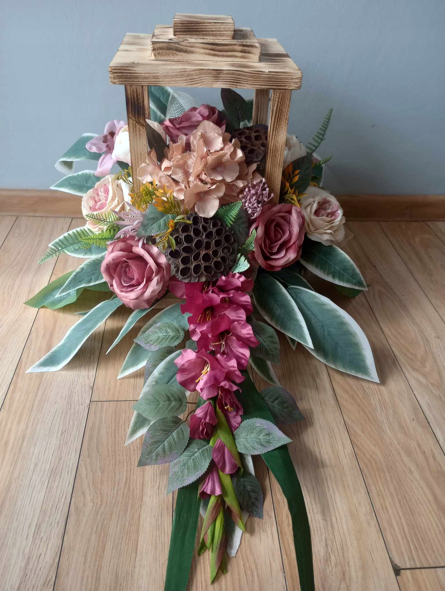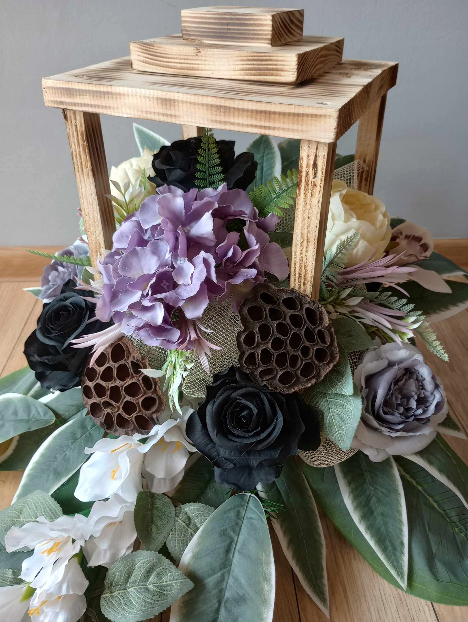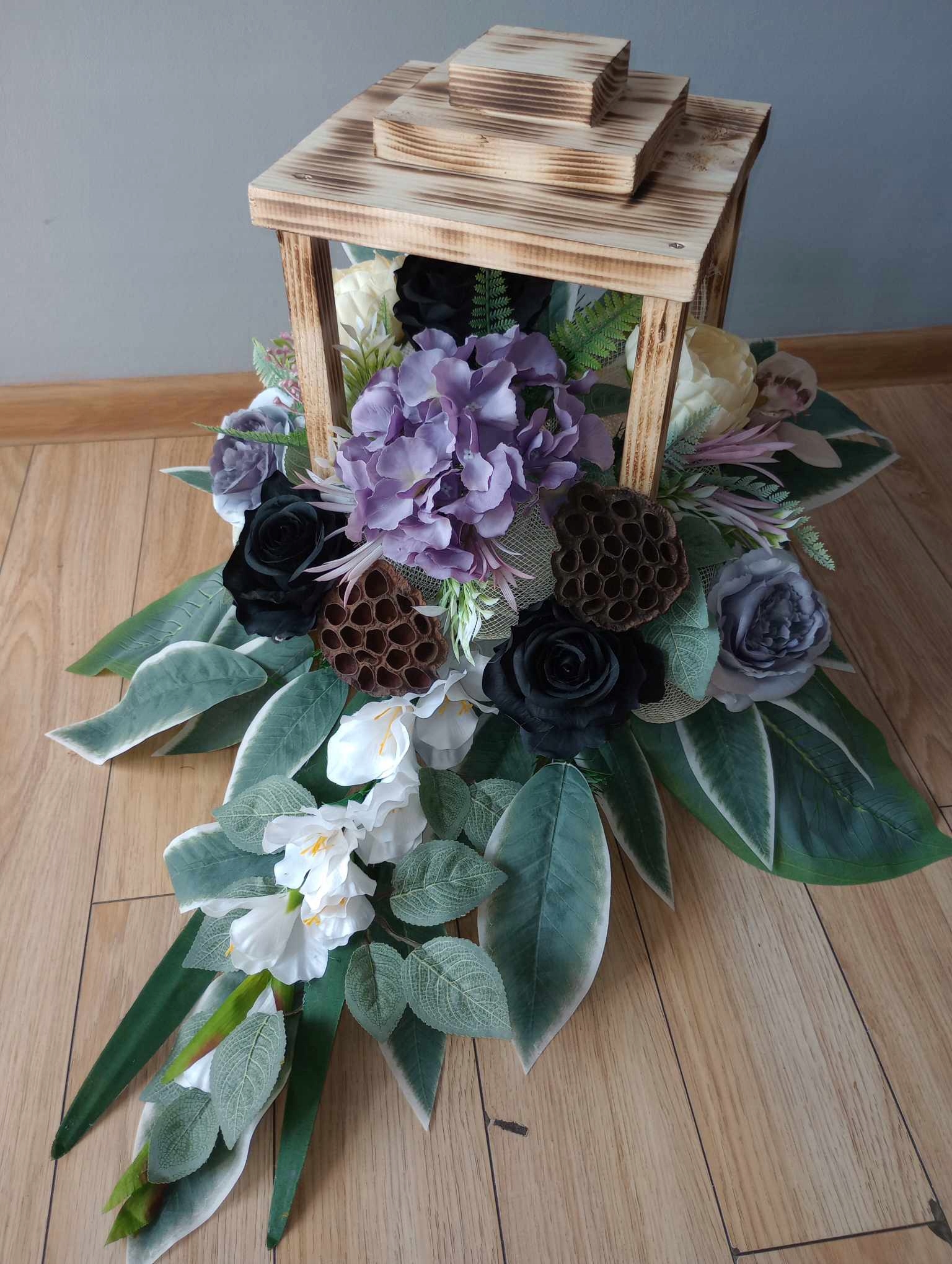 Искусственная композиция (т. н. венок, икебана) изготавливается из искусственной елки, забетонированной в пластиковом горшке, помещенном в деревянный ФОНАРЬ, что придает ей устойчивость. Бетон придает ему соответствующий вес, что предотвращает скольжение могильной композиции. Состав ок. Длина 60 см, высота 45 см.