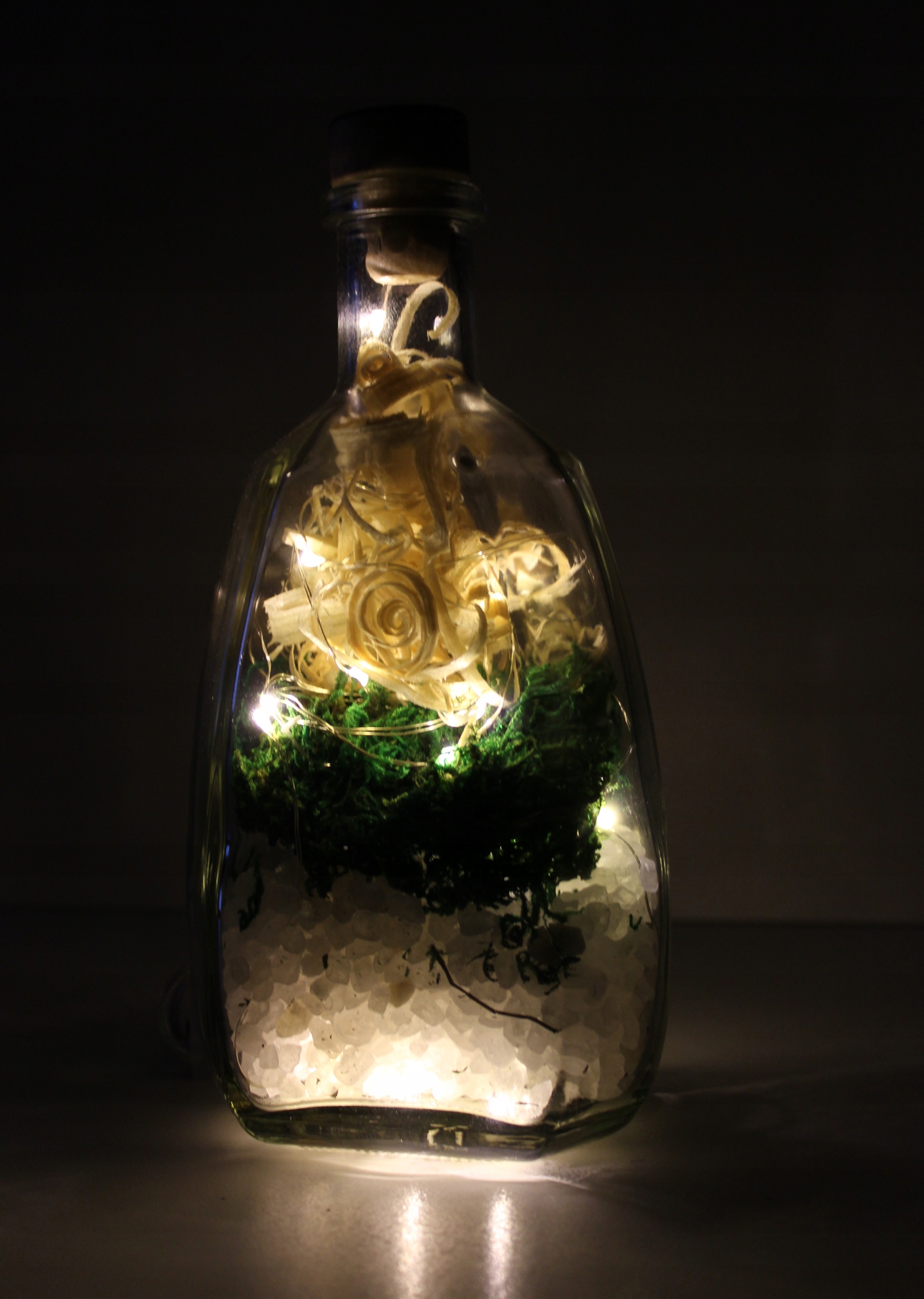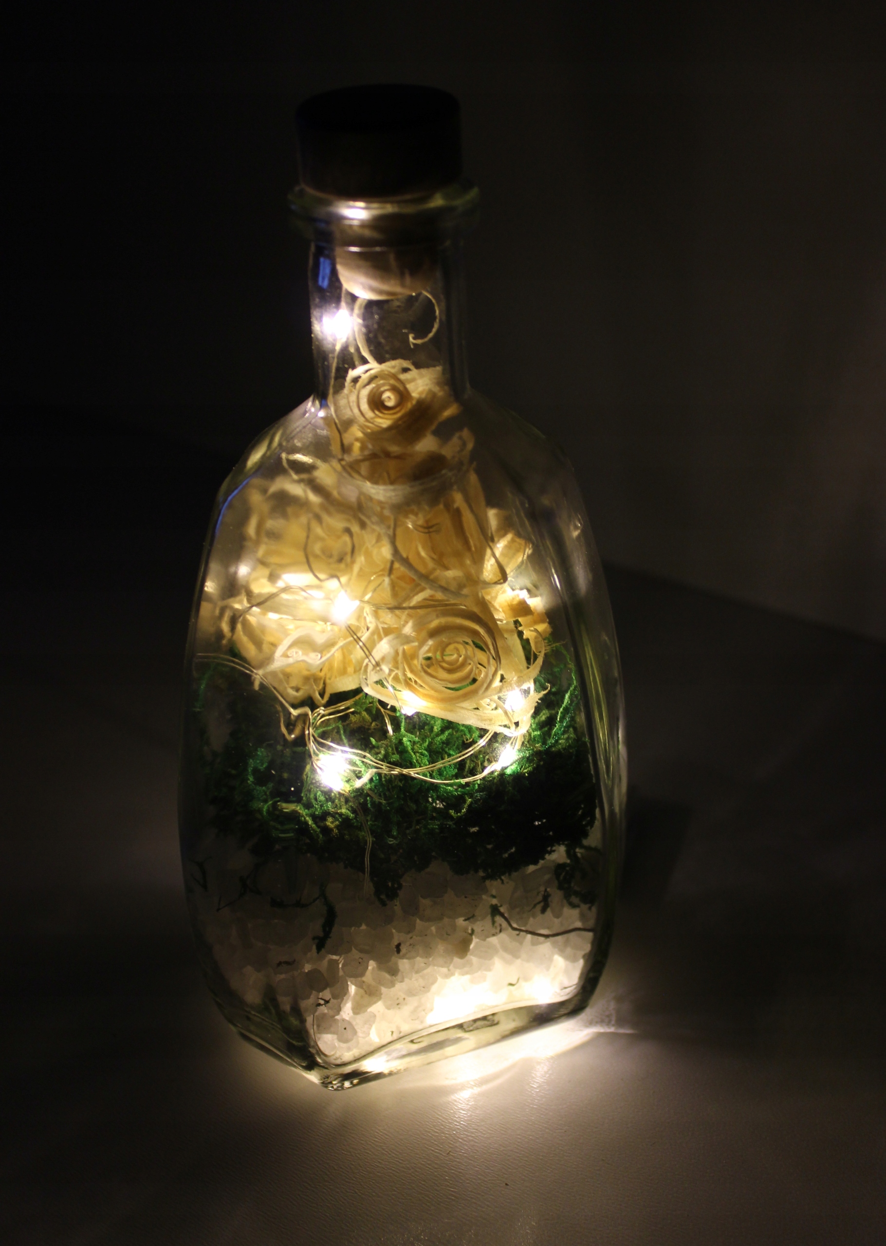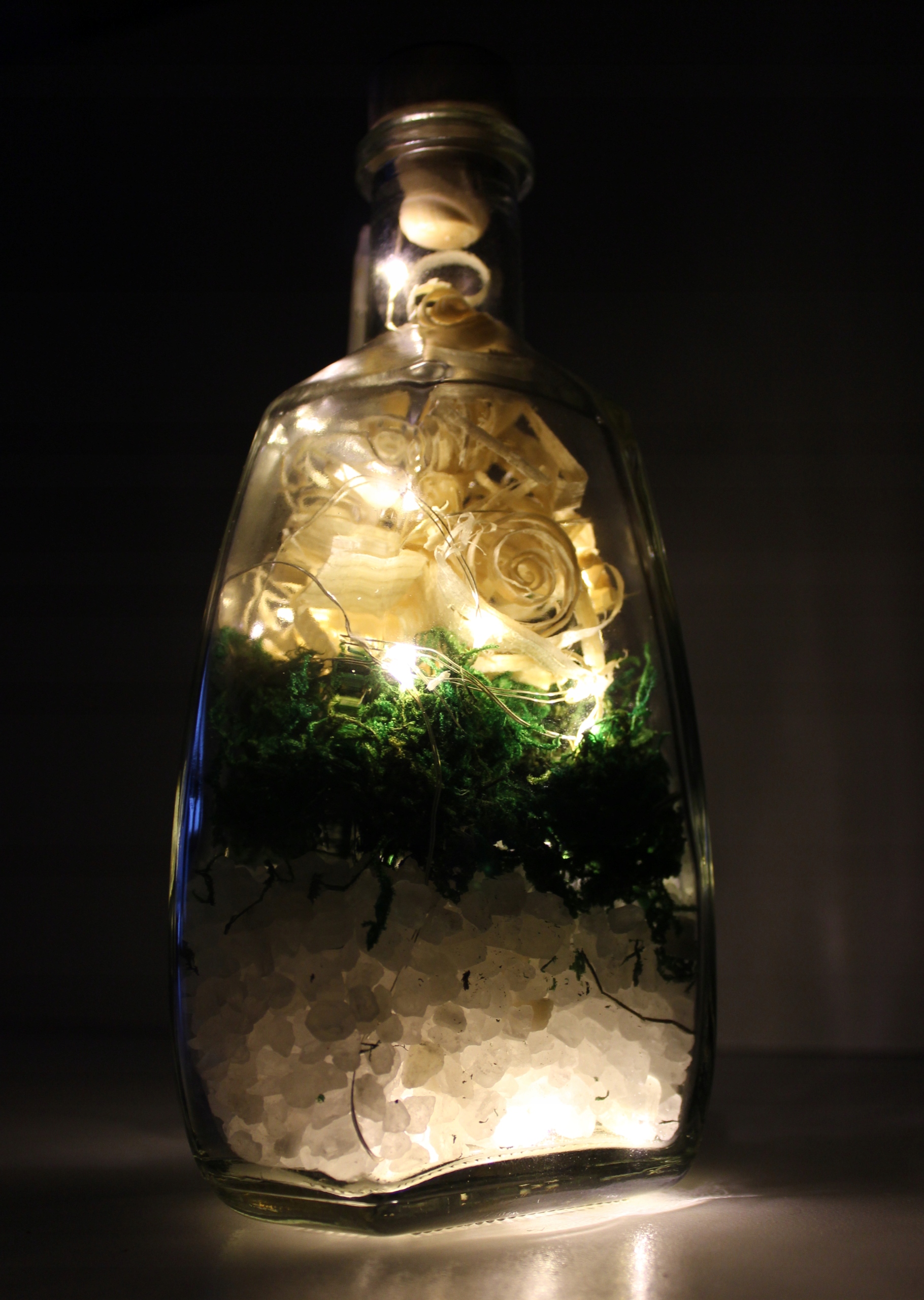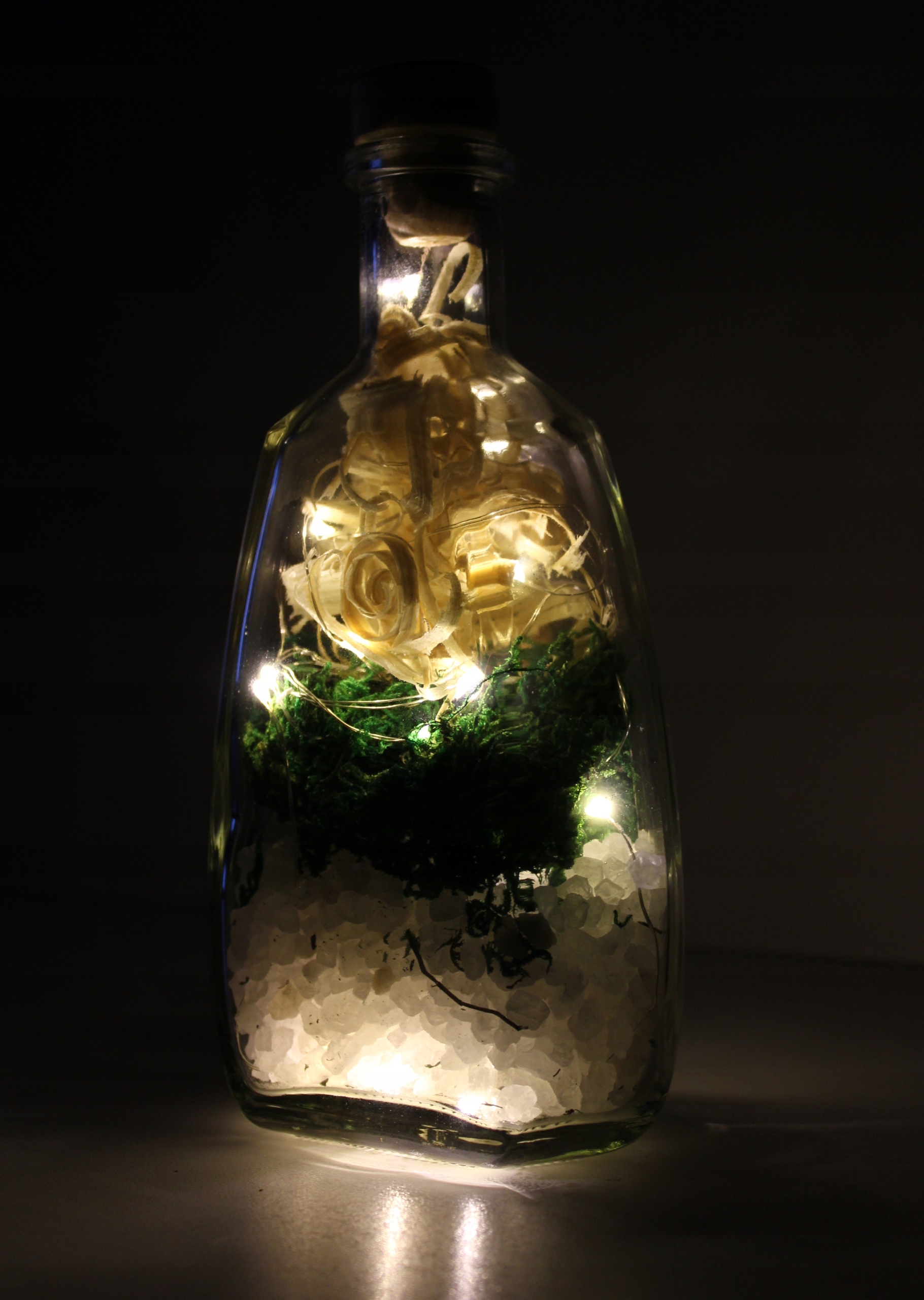 Украшение из стекла - BKSMW-L20C - декоративная бутылка, наполненная крупнозернистой солью, деревянной стружкой и натуральным мхом со светодиодной подсветкой.