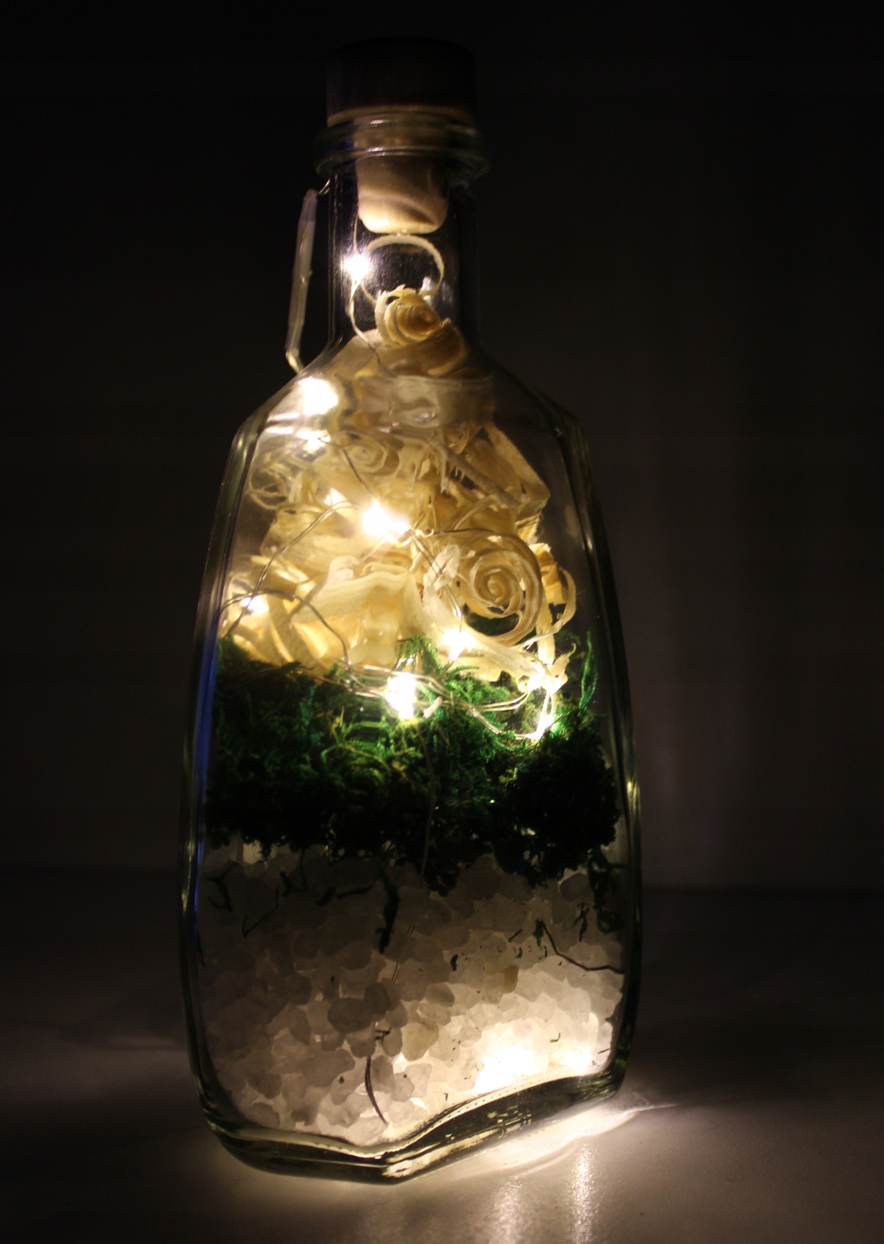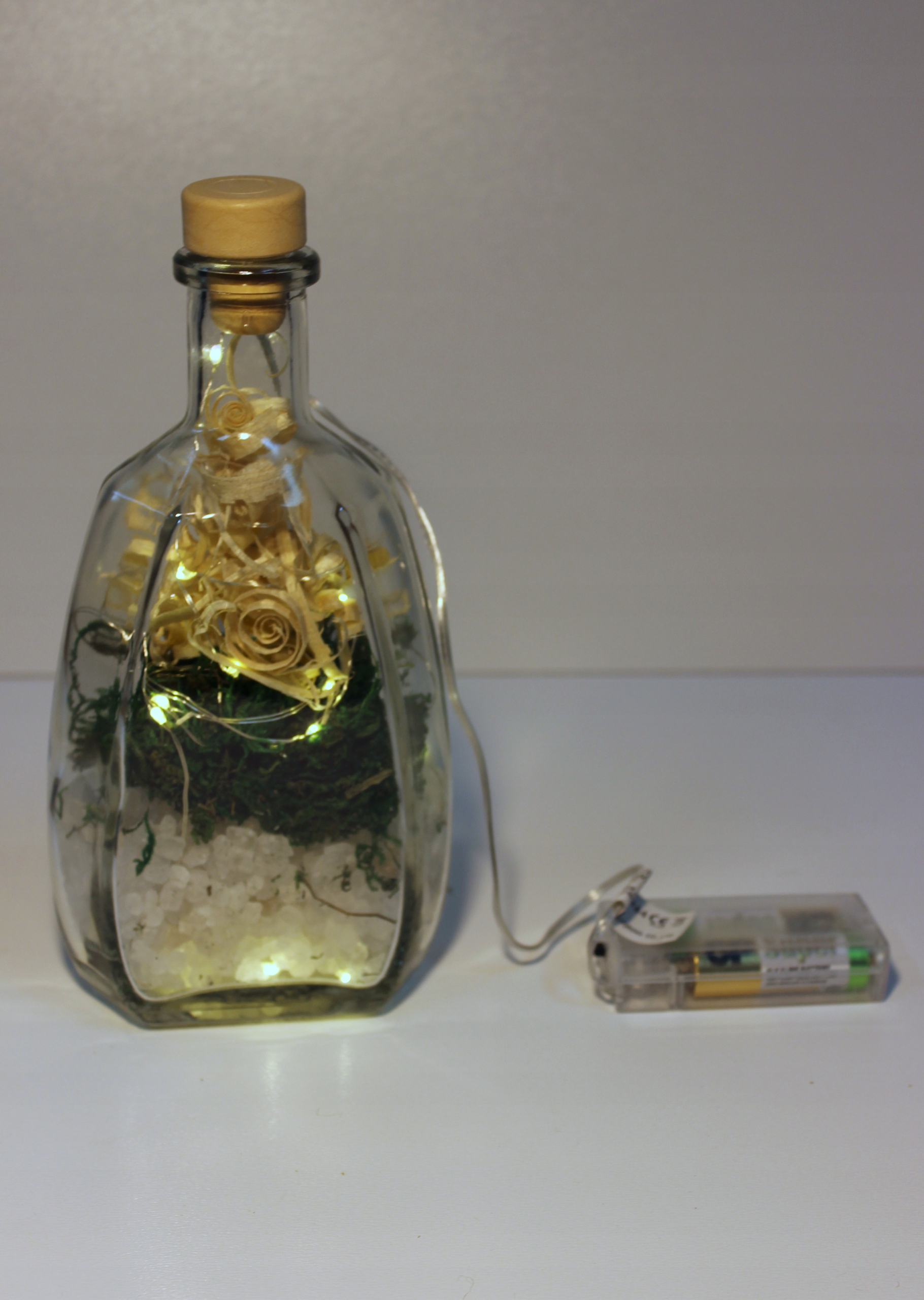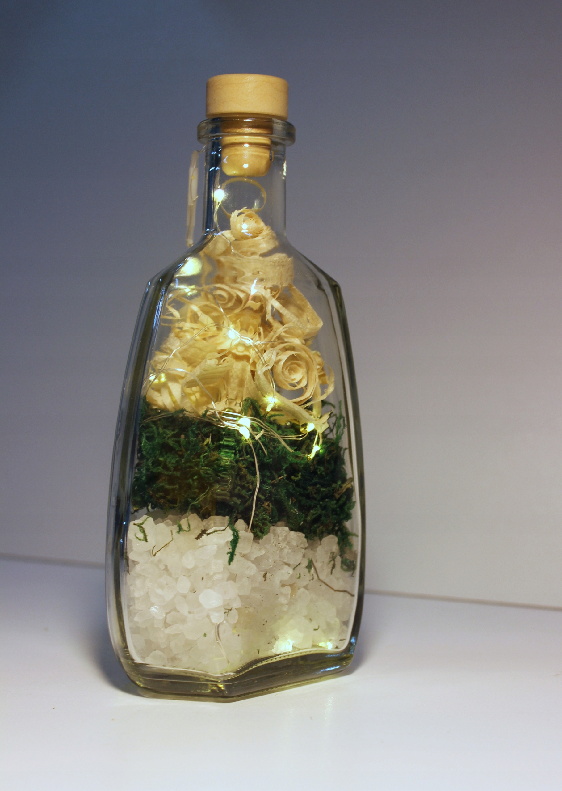 Украшение в виде декоративной стеклянной бутылки с пробковой пробкой. с полнотой природы: крупнозернистая Клодавская соль, натуральный мох и тщательно отобранная древесная стружка. В бутылке также находится специальная светодиодная цепочка. Он состоит из двадцати светодиодных ламп теплого белого цвета, соединенных тонким медным проводом, который является дополнительным декоративным элементом. Лампы питаются от двух батареек LR6/AA (типовые «пальчиковые»), помещенных в контейнер с выключателем света снаружи флакона.