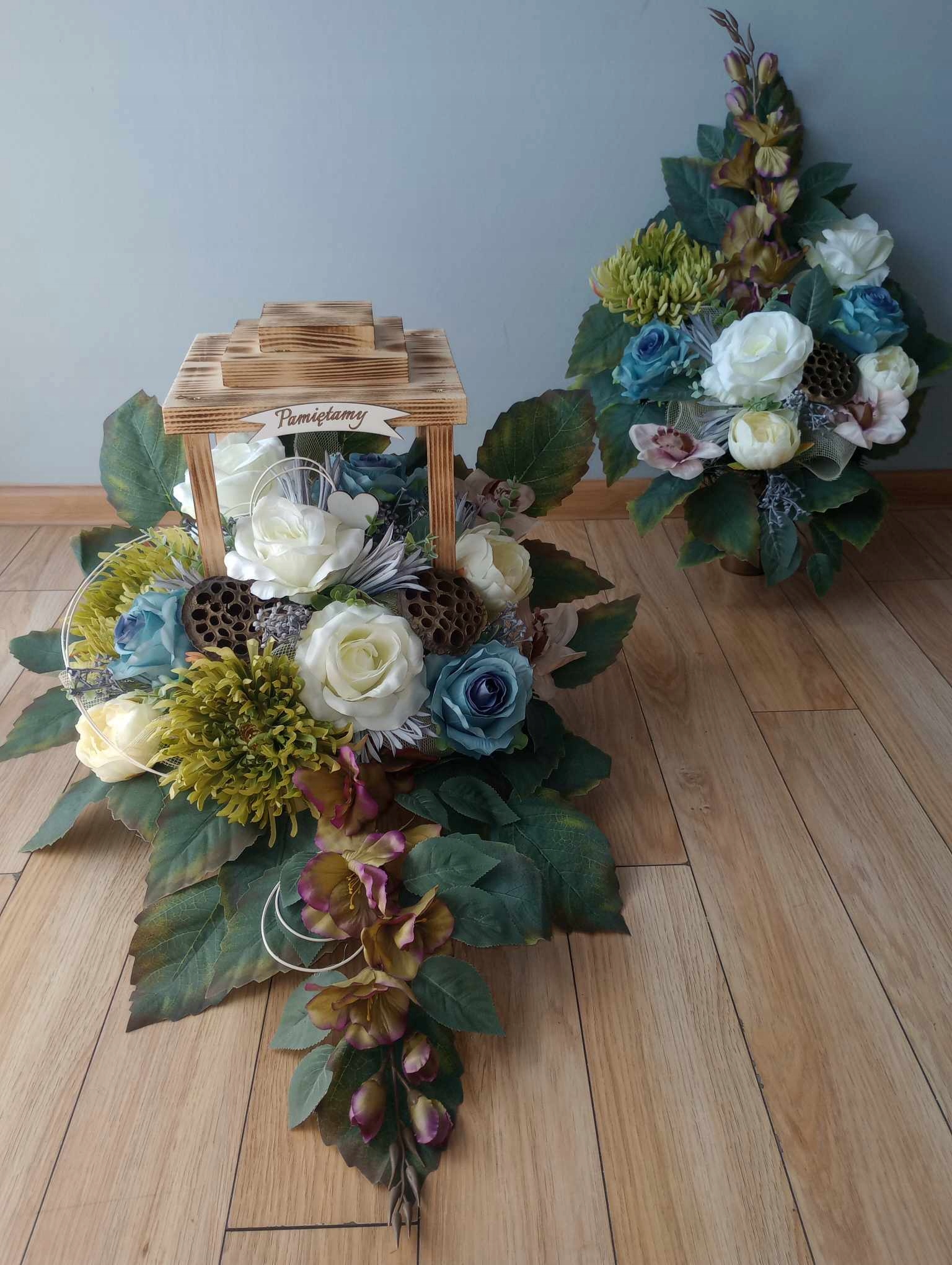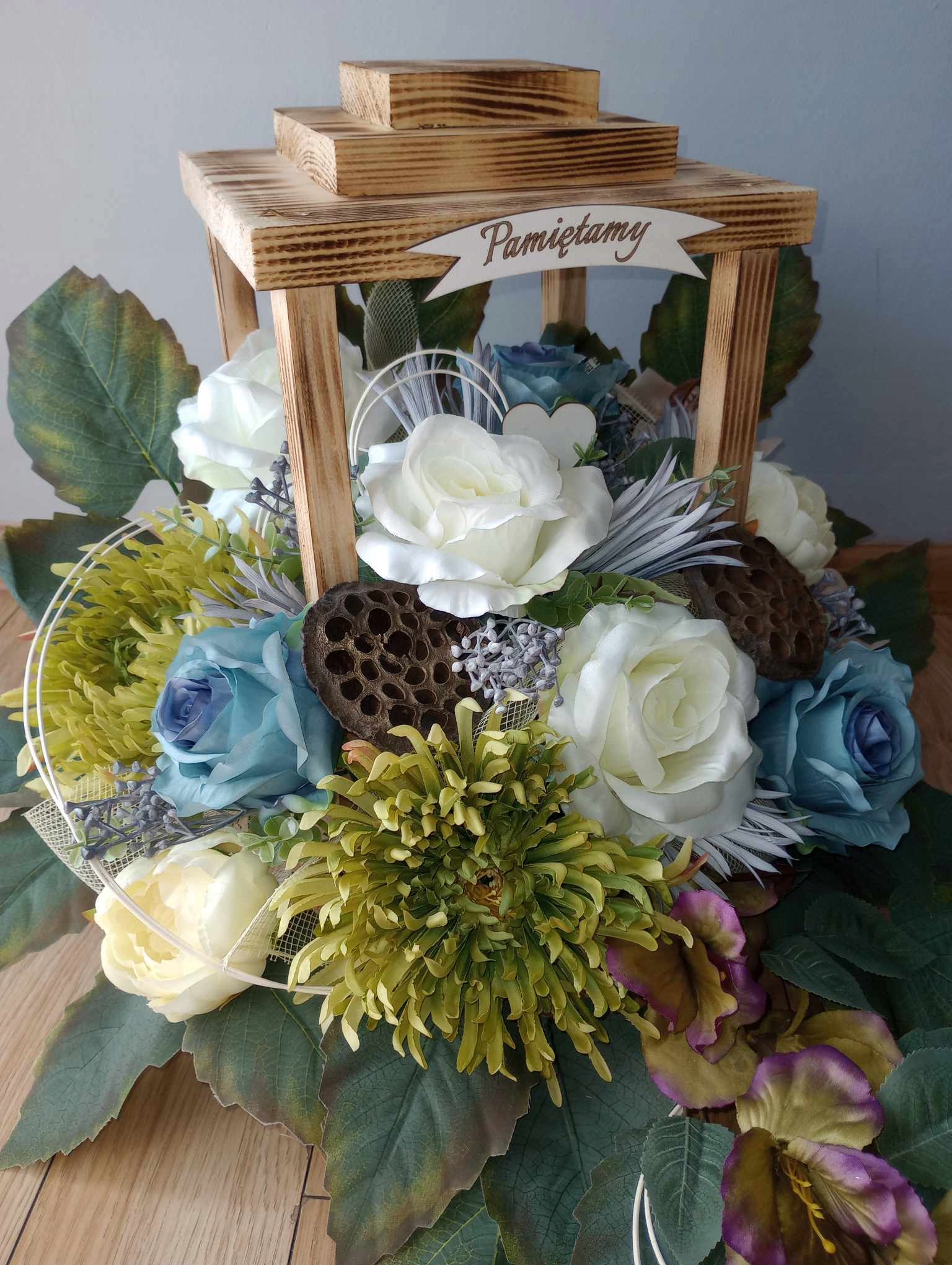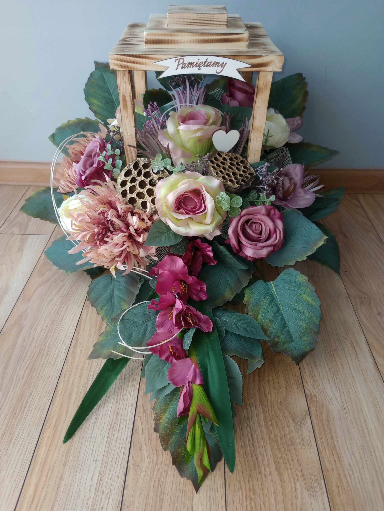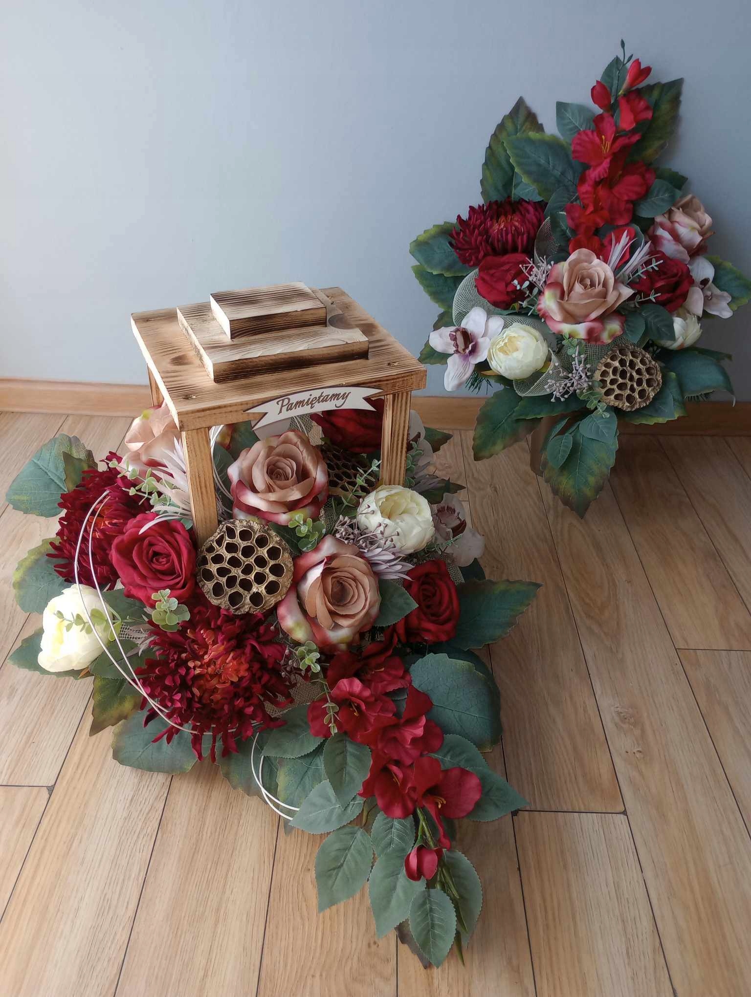 Искусственная композиция (так называемый венок, икебана) изготавливается НА ФОНАРЬЕ из деревьев - что придает ей устойчивость. Вы можете выбрать его цвет: загорелый, белый или черный. Композиция с фонарем примерно 60 см в длину и 45 см в высоту.