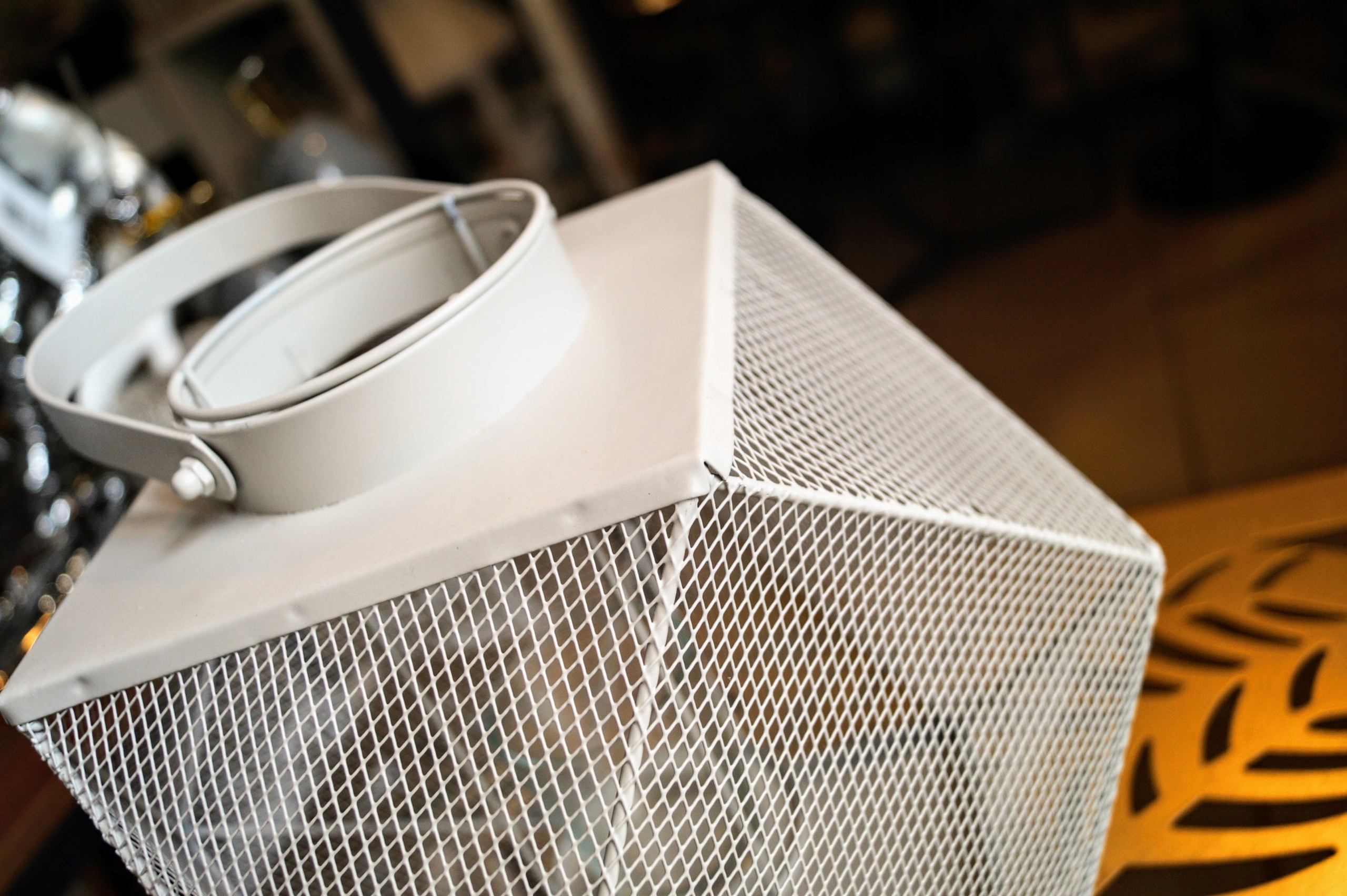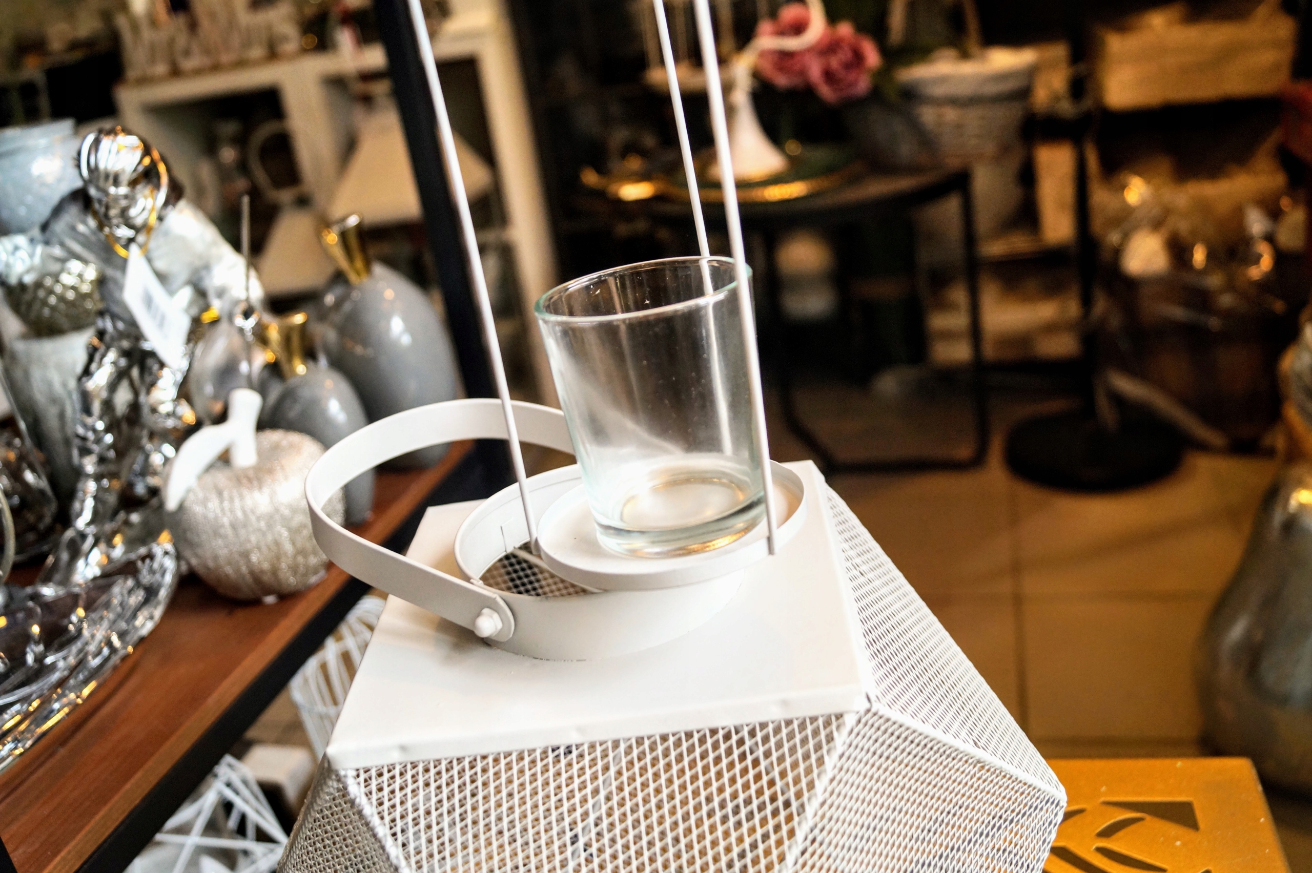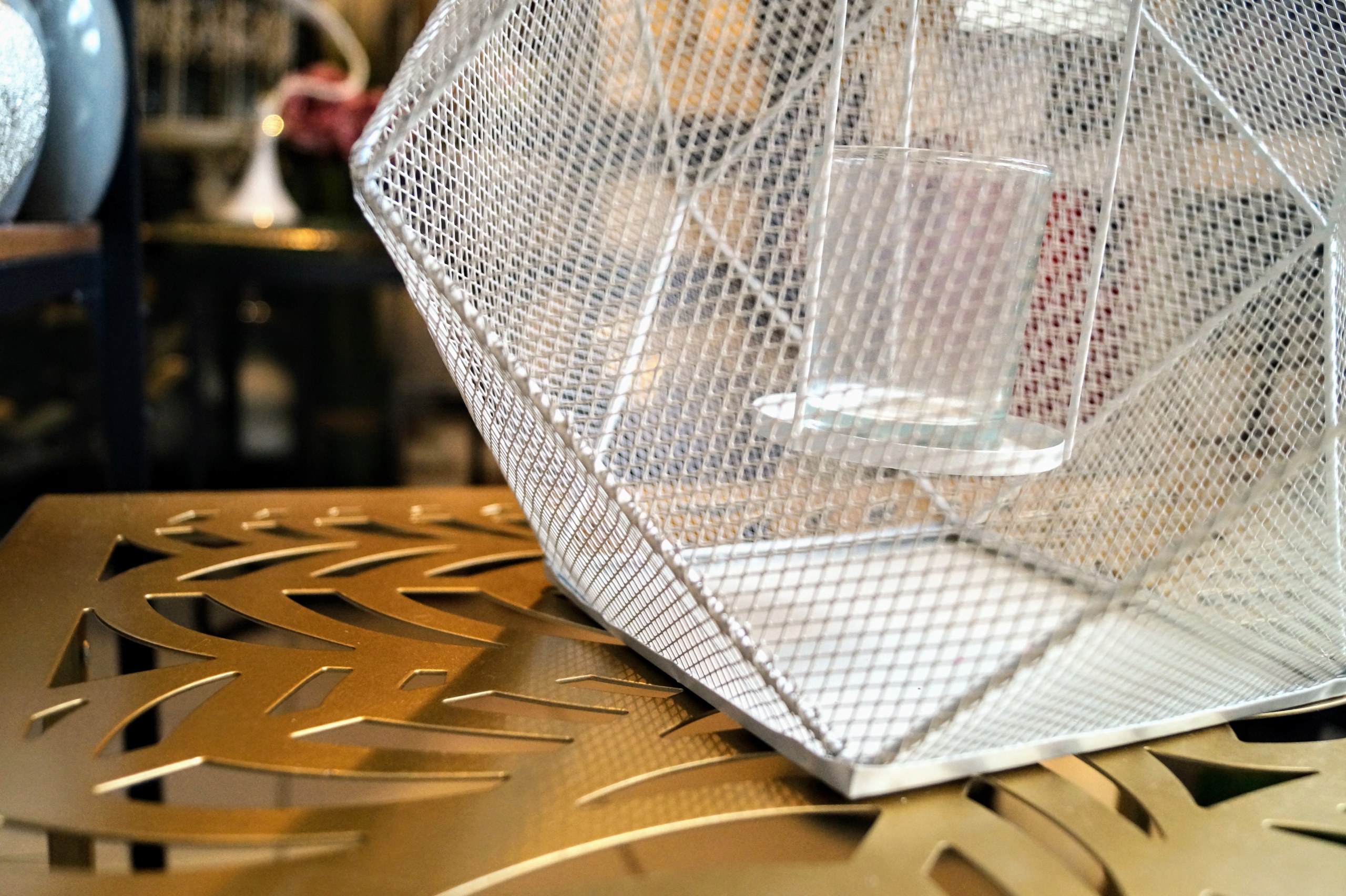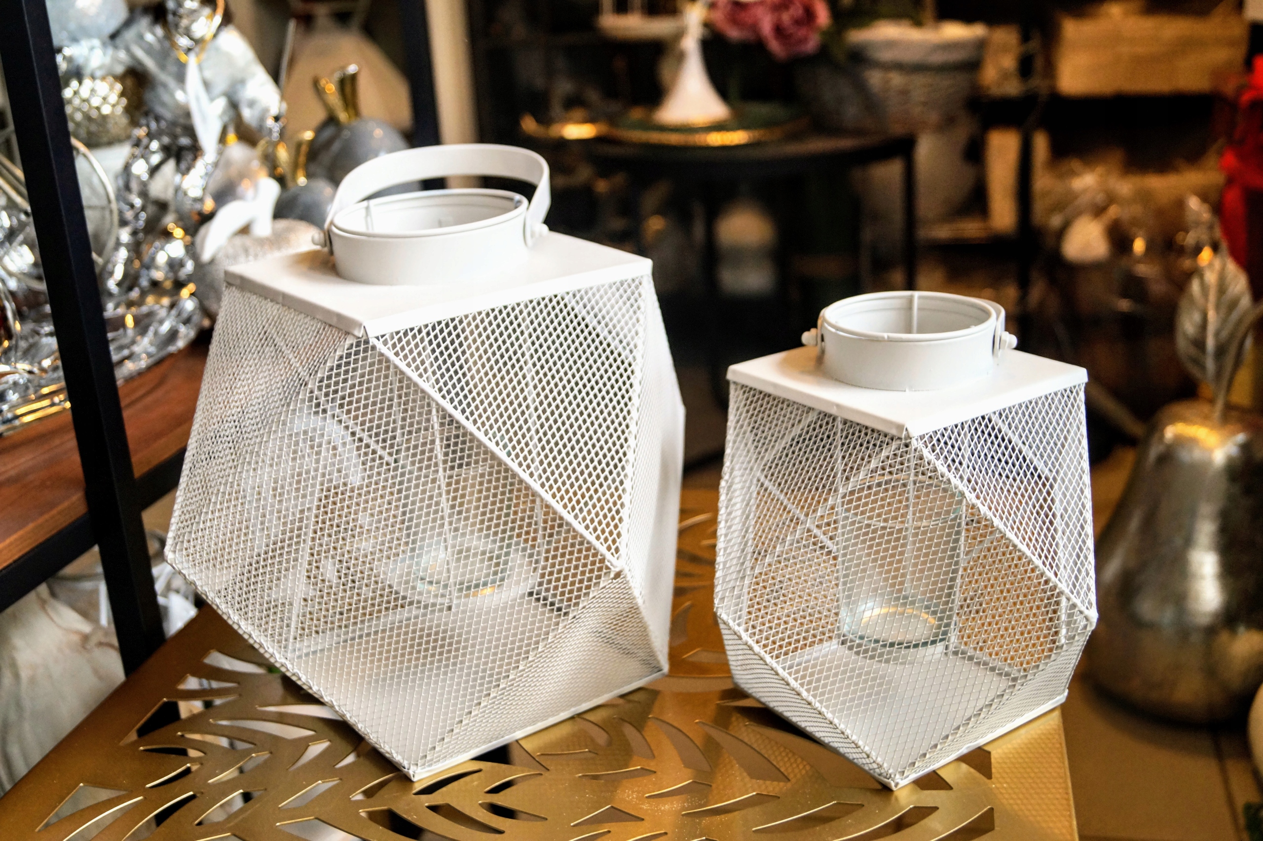 Металлический фонарь геометрической формы, с ажурными стенками.