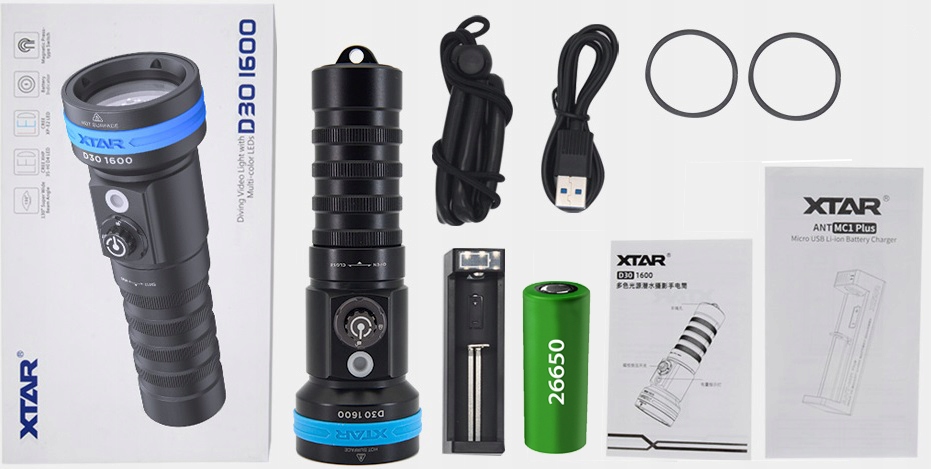 Полный комплект XTAR D30 1600, светодиодный фонарик для дайвинга, яркость 1600 лм + аккумулятор.