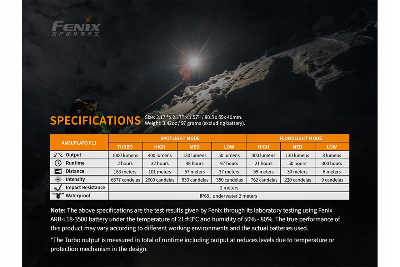 представленные параметры были получены в лабораторных условиях. Во время испытаний был использован батарея Fenix ARB-L18 18650 3400 мАч. 3,6 В h2> батарея