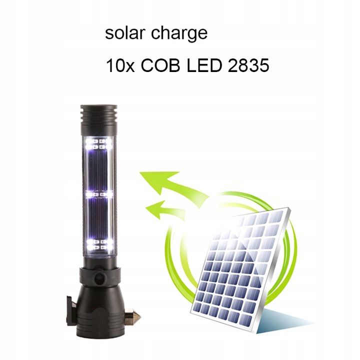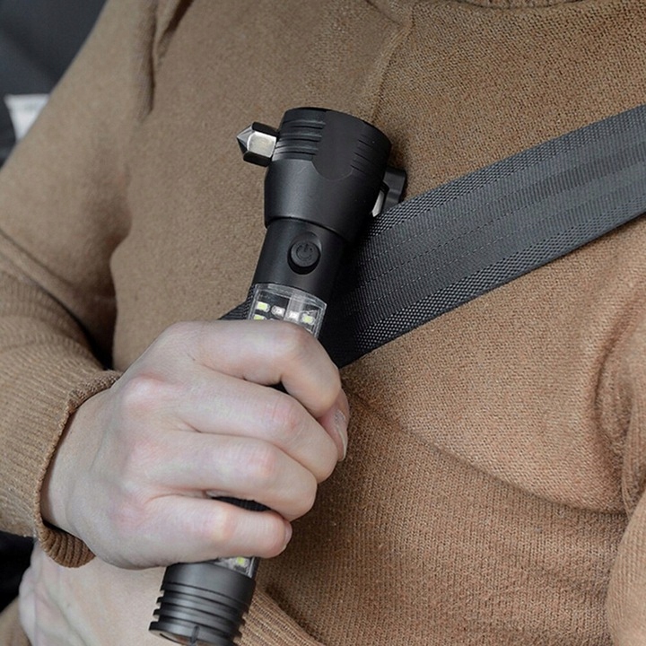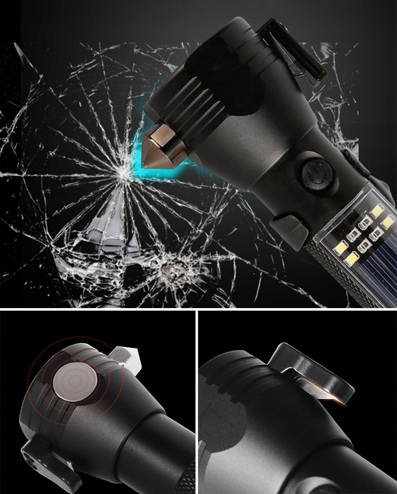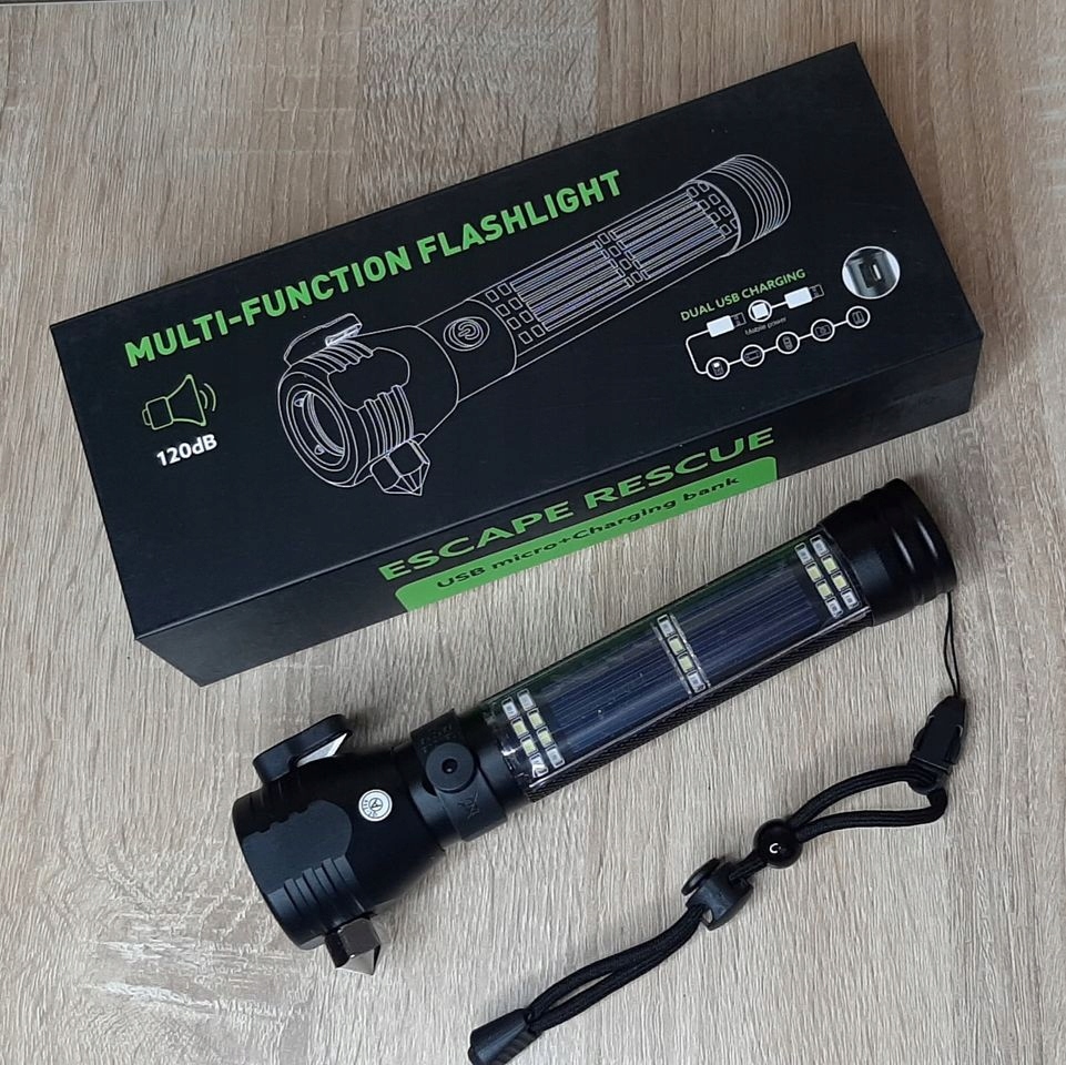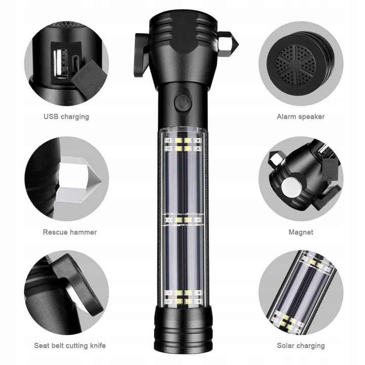 Головка фонаря оснащена магнитом, молотком и ножом, которым при необходимости можно перерезать ремень безопасности автомобиля. На конце фонаря расположен громкоговоритель мощностью 120 дБ с предупредительной сигнализацией ПОЛИЦИЯ ПОЖАРНАЯ ЧРЕЗВЫЧАЙНАЯ СИТУАЦИЯ. Вход USB используется для зарядки фонаря, а вход micro USB предназначен для мобильного телефона, где вы можете использовать фонарик в качестве пауэрбанка!