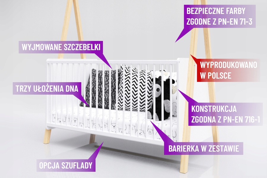 Кроватка производится в Польше, и она соответствует применимым стандартам безопасности и стабильности для детских кроваток . Кроме того, он имеет положительные результаты исследований, проведенных Институтом Wood , исследовательская лаборатория, аккредитованная польским центром для аккредитации Мы предоставляем вам высокое качество и высокое качество и безопасность для вашего ребенка