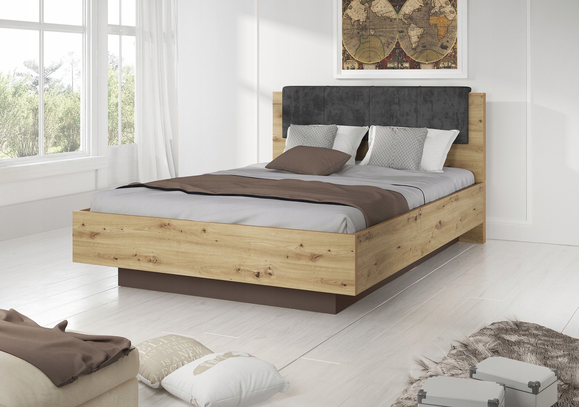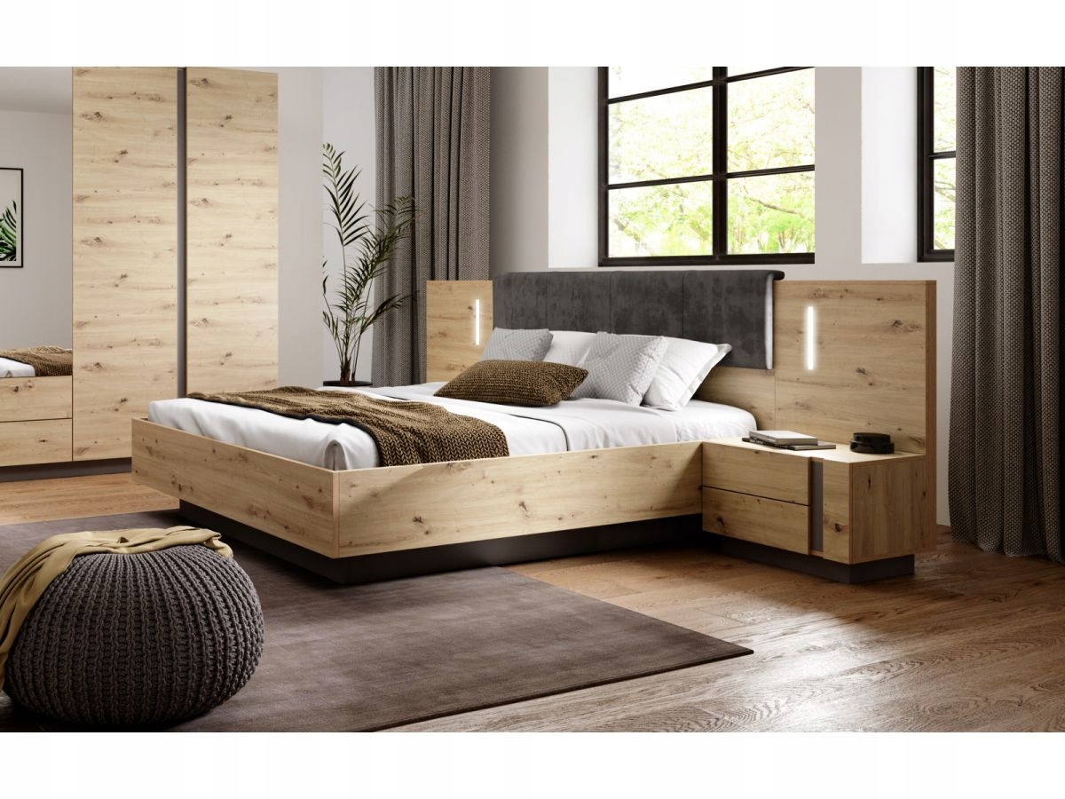 Благородный цвет дуба, отсылающий к природе, подчеркнутый контрастным необработанным графитом, придаст вашей спальне неповторимый и оригинальный вид.