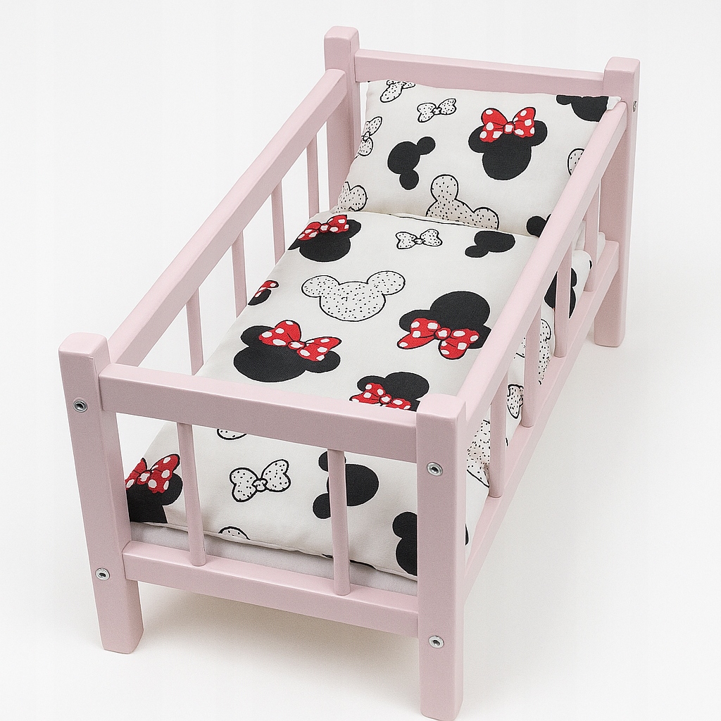 ДЕРЕВЯННАЯ РОЗОВАЯ КРОВАТЬ + постельное белье из 3 предметов для кукол