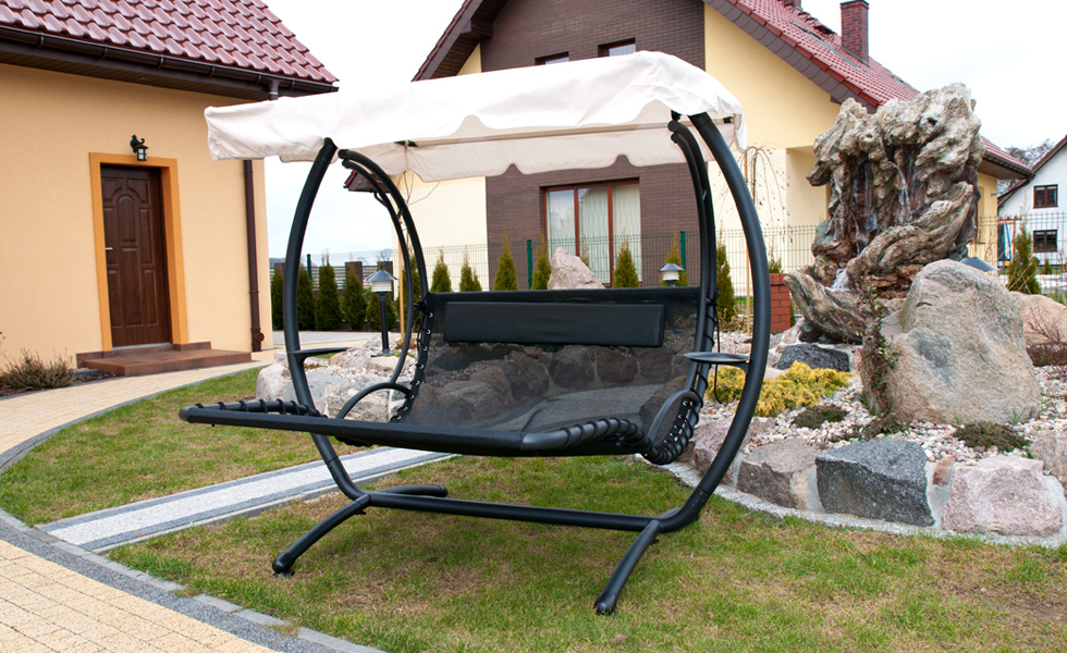 Современный, стильный дизайн ставит нашу продукцию на первое место среди гамаков-шезлонгов по удобству и полезности садовых товаров. Конструкция двухместного шезлонга изготовлена из прочных толстых стальных труб, что обеспечивает очень высокую устойчивость. Все покрыто порошковой краской, что гарантирует устойчивость к погодным условиям на долгие годы. Чехол на диван изготовлен из полиэтилена, который очень прочный и приятный на ощупь. Для повышения комфорта отдыха наше изделие оснащено навесом, защищающим пользователя от солнечных лучей, а также от неожиданного дождя