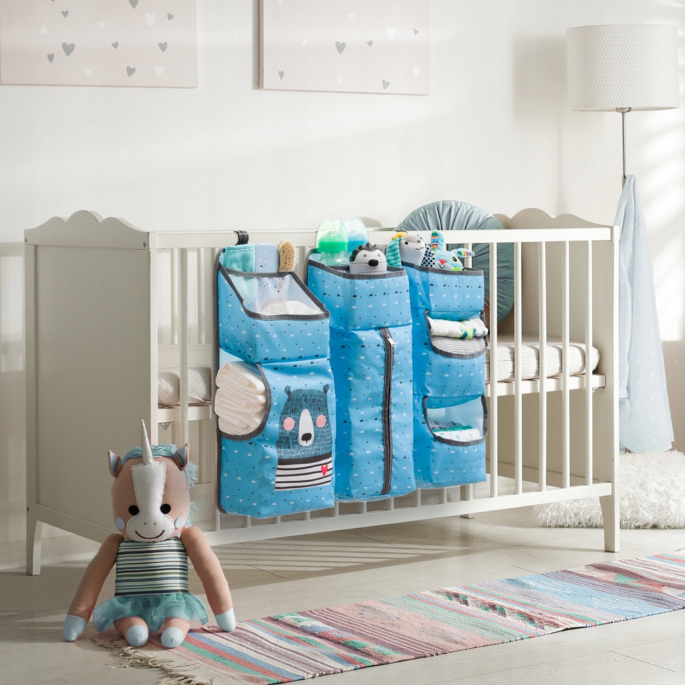 Органайзер для кровати позволит в организованном порядке хранить детскую одежду, игрушки, косметику и подгузники. Органайзер состоит из трех частей, поэтому при необходимости его можно разделить и разместить в соответствующих местах, например, в шкафу, спинке стула или каркасе кровати.