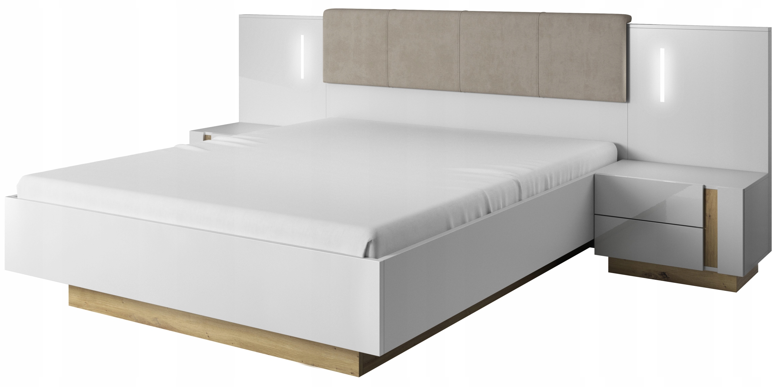 В стоимость входит кровать с каркасом и контейнер с газлифтами и 2 шт. прикроватная тумбочка с подсветкой (без матраса).