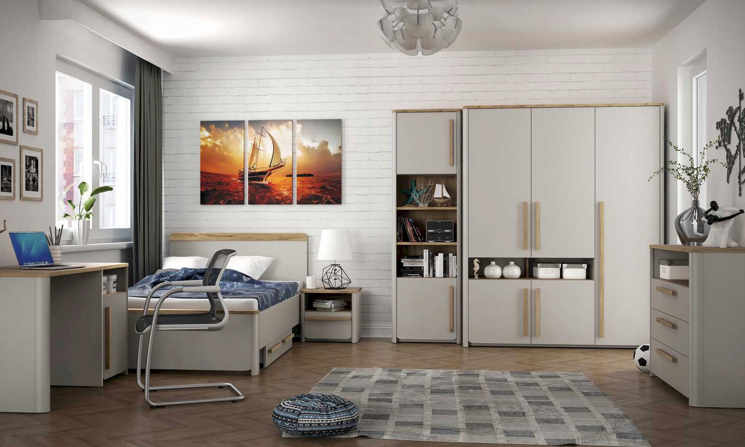 Коллекция Surfinio от производителя Forte – прекрасное решение для обустройства современной молодежной комнаты. Система включает в себя, среди прочего: письменный стол, комод, шкаф и кровать с дополнительным ящиком. Блоки модного серого цвета оснащены столешницей и деревянными ручками геометрической формы, выполненными в цвете Дуб Катания. Мебель Surfinio можно легко использовать в любом обустройстве детской комнаты.