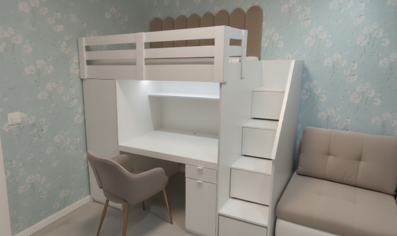 - Большая столешница: При стандартных размерах кровати площадь столешницы составляет 147 x 60 см, обеспечивая удобное пространство для учебы и игр.