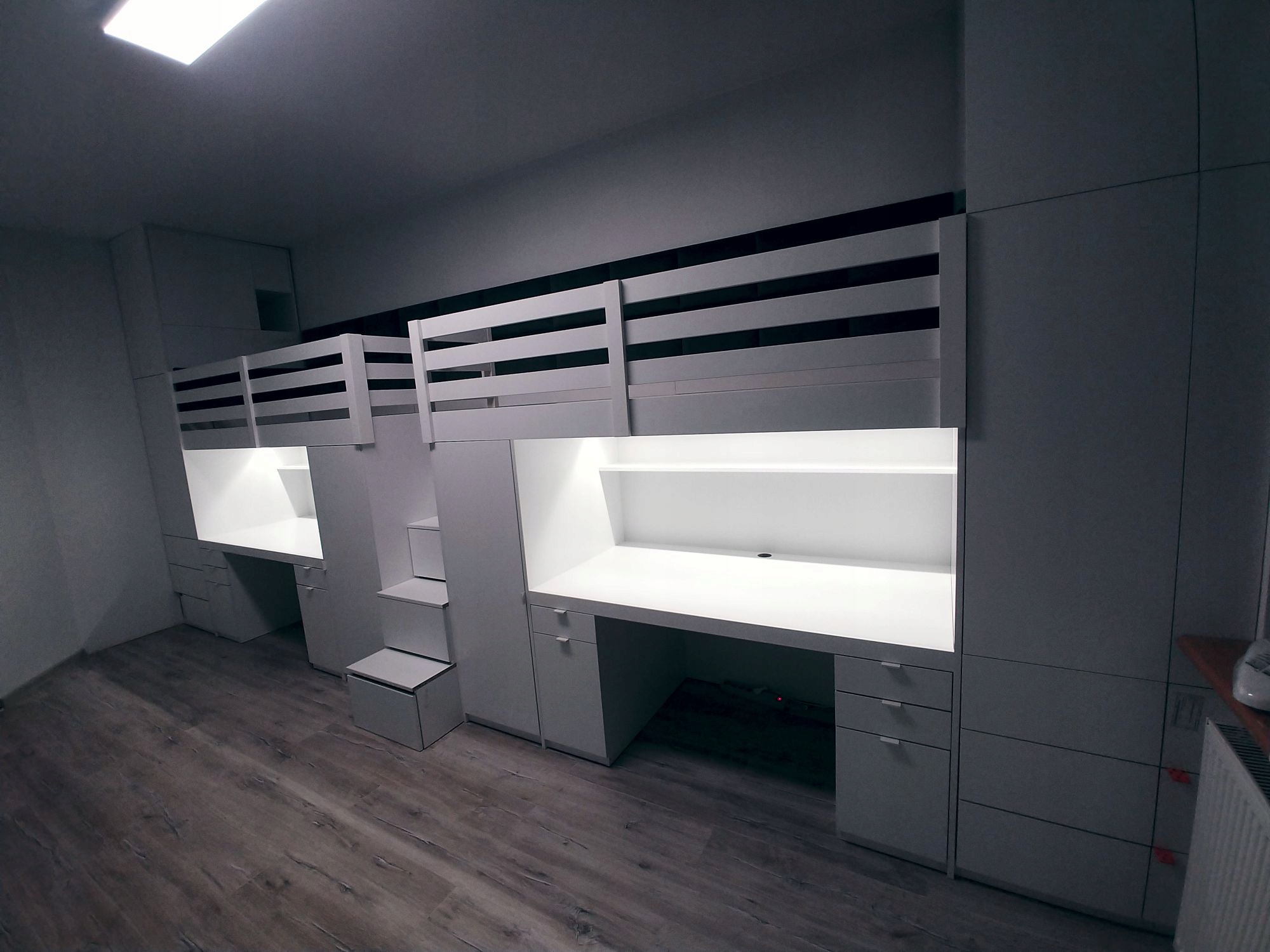 Размеры письменного стола с размером матраса 200 х 90 см составляют целых 60 х 147 см! Над столом мы разместили стандартную светодиодную ленту с естественным светом, которая равномерно освещает всю поверхность стола.