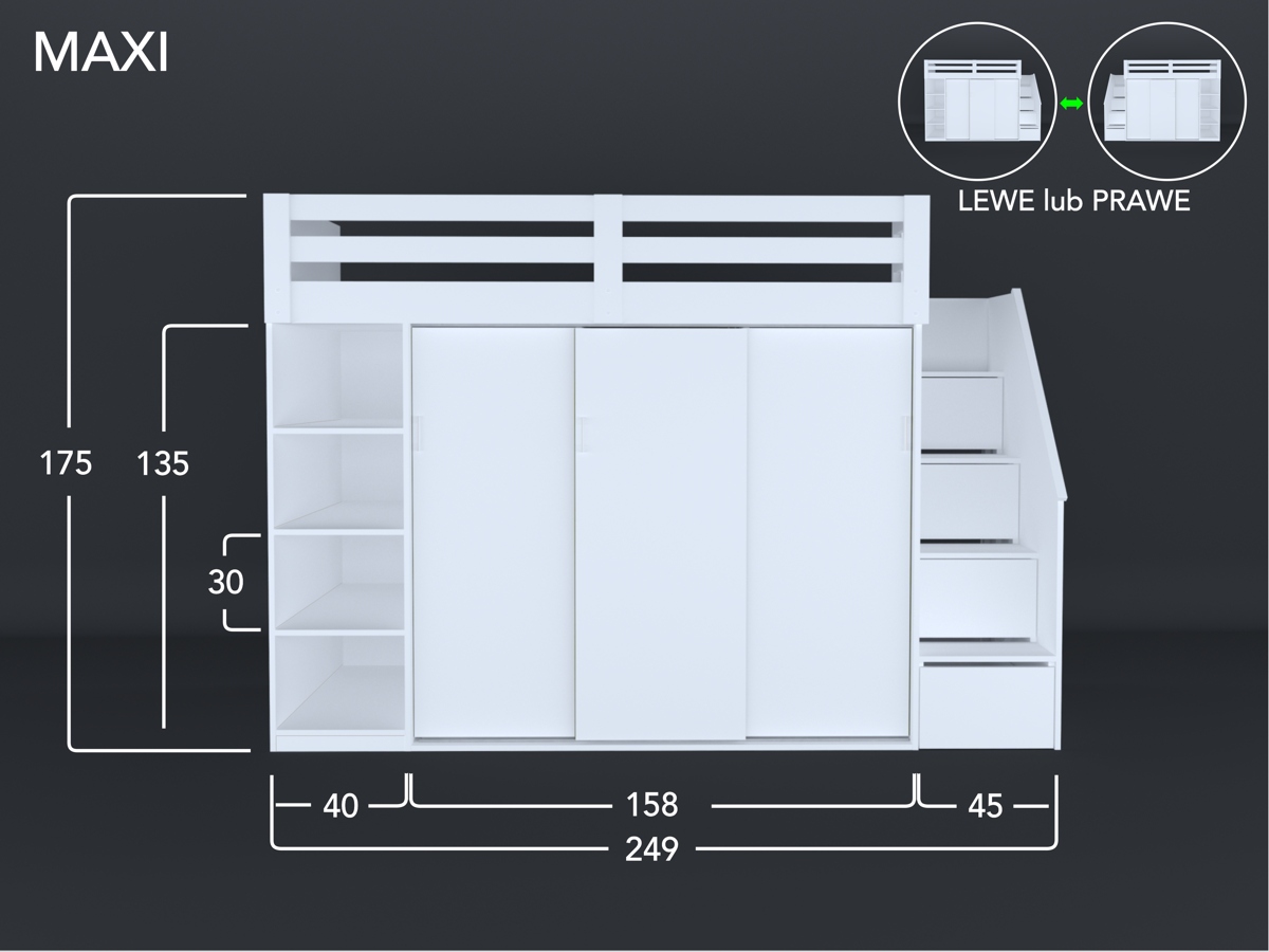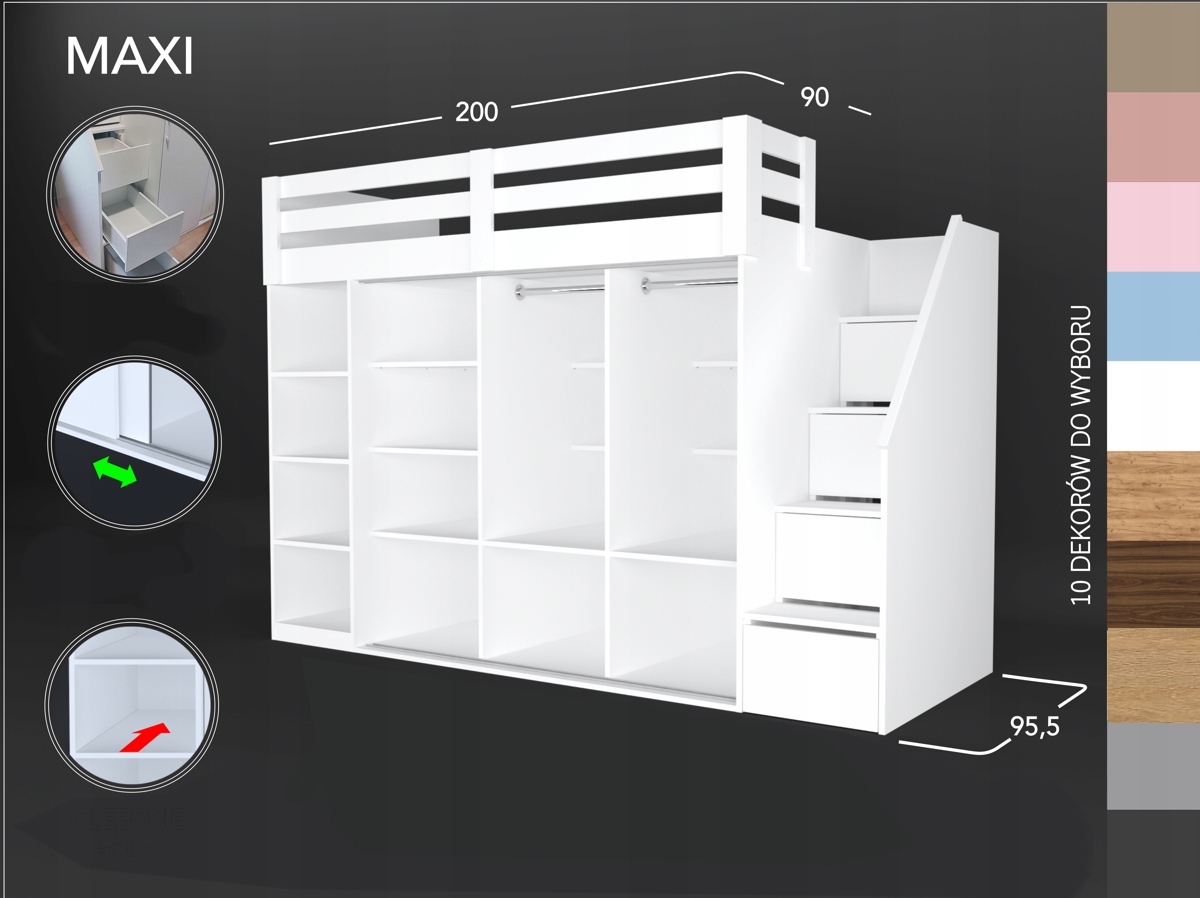 Примечание: мы хотели бы сообщить вам, что в настоящее время мы принимаем заказы с датой реализации до 6 недель. С нуля. Условия транспорта и сборки определяются на основе типа порядка и расстояния. Пространство под мезонином. Элемтный 3-дверный гардероб глубиной до 95 см, как и открытый книжный шкаф. Интерьер гардероба может быть оборудован глубокими полками или стержнями и небольшими полками за ним. Фронты гардероба скользят. Благодаря его форме и возможностям модификации цвета, кровать может обслуживать как более молодых, так и пожилых пользователей. Мы делаем индивидуальные изменения в проектах и адаптируем их к потребностям клиента. Толстая мебельная доска. Мы используем материал внутреннего производства, несравненно твердый, чем легкие платы, используемые в известных сетях и импортированных продуктах. Кровать-150 кг