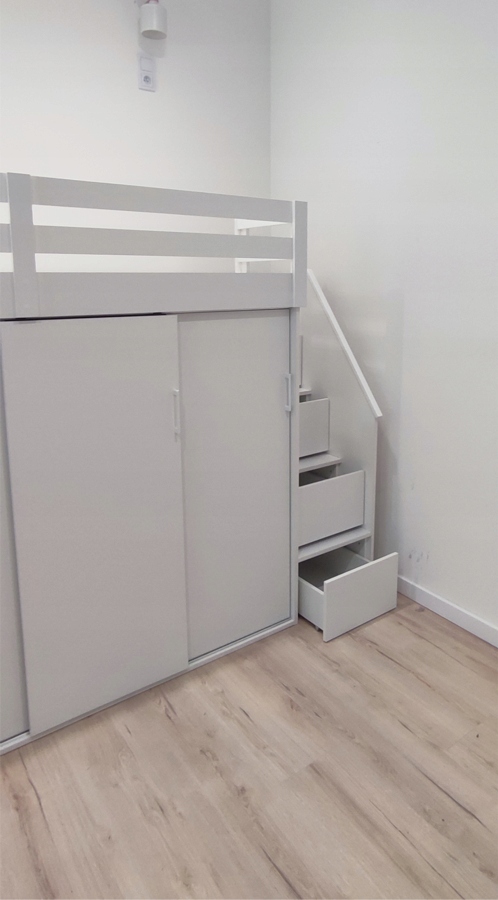 Кровати оснащены лестницей шириной 45 см. Внутри ящики скрыты с использованием максимальной глубины каждой из шагов, от 80 до 25 см Каждый из шагов поддерживается на краях на полу, что позволяет безопасно использовать даже взрослым