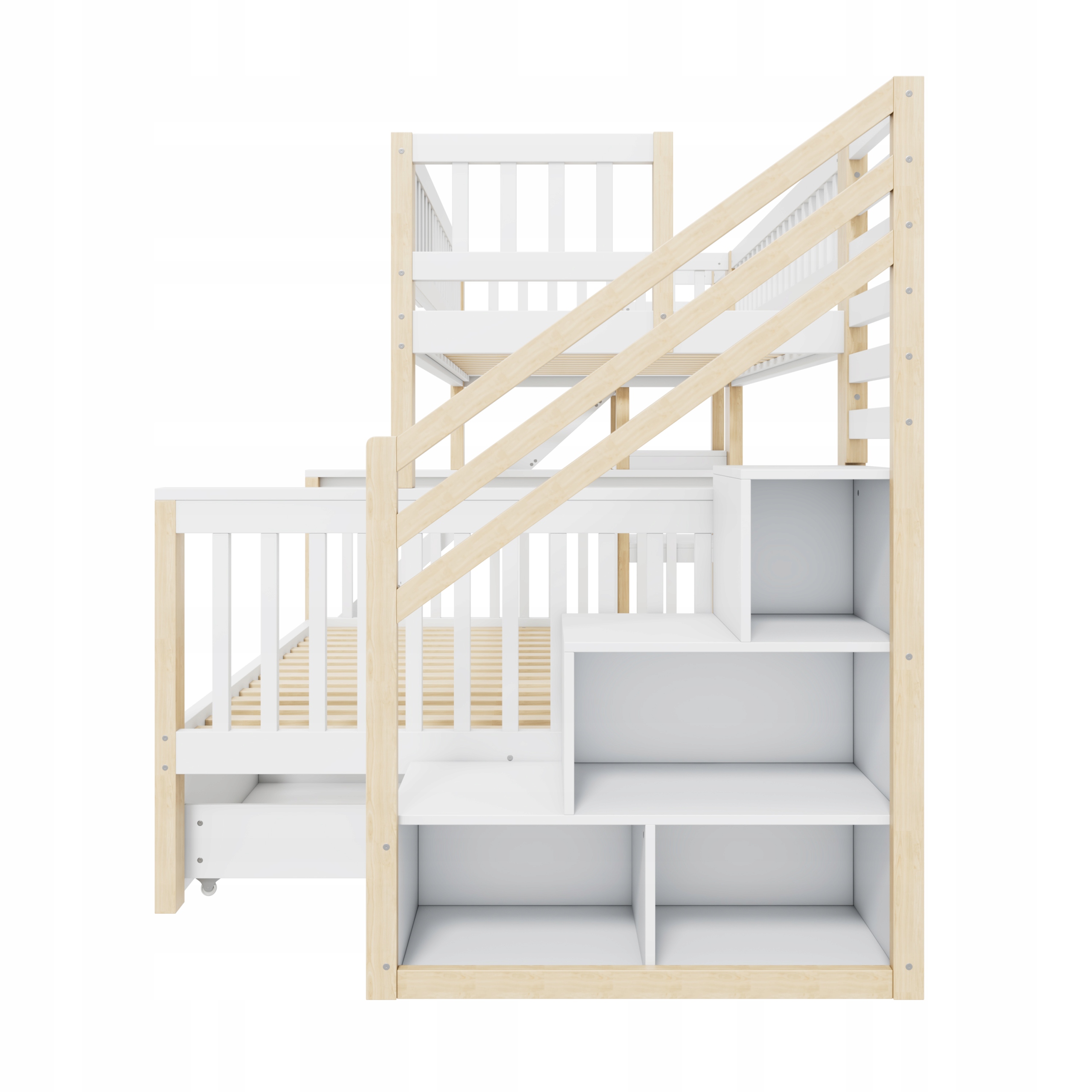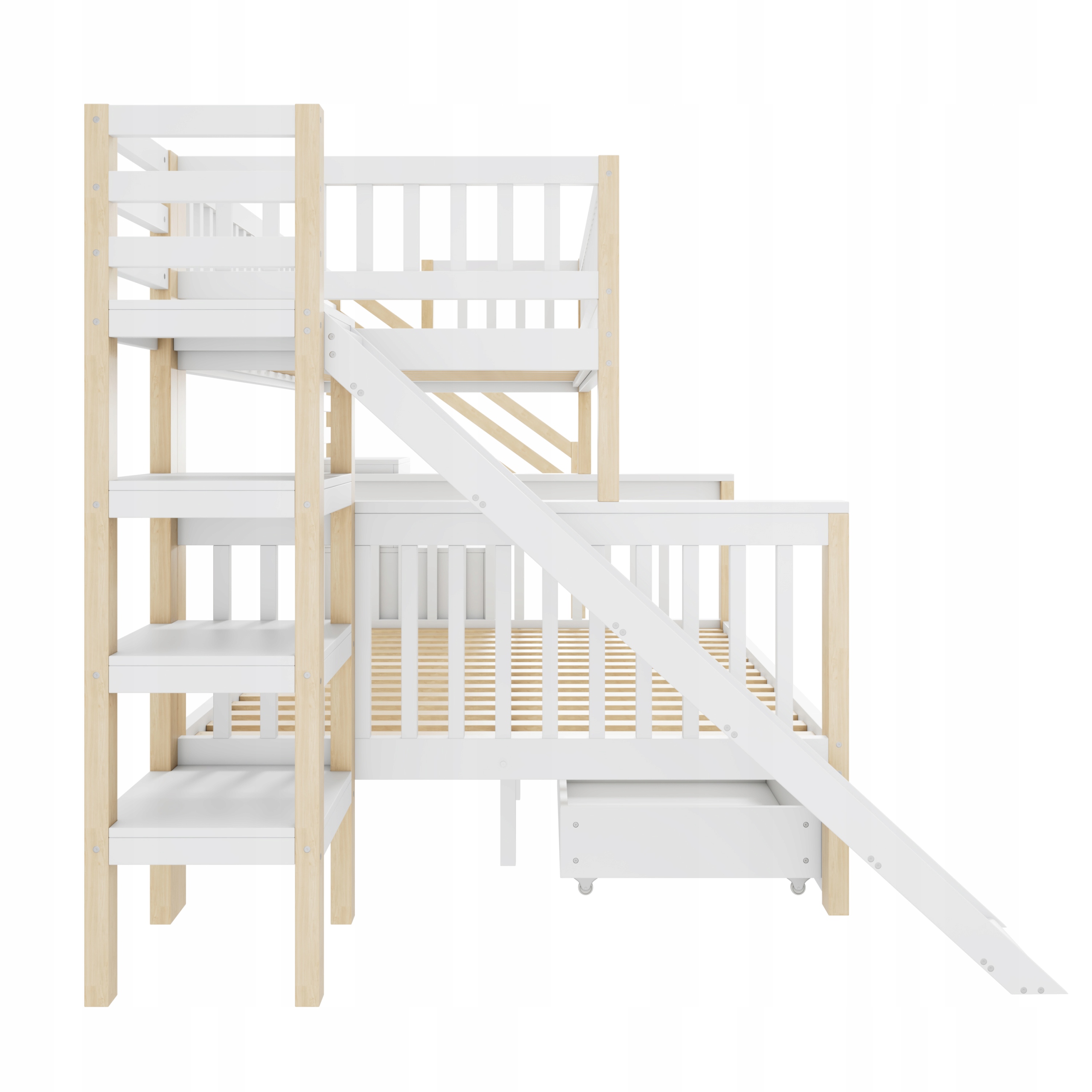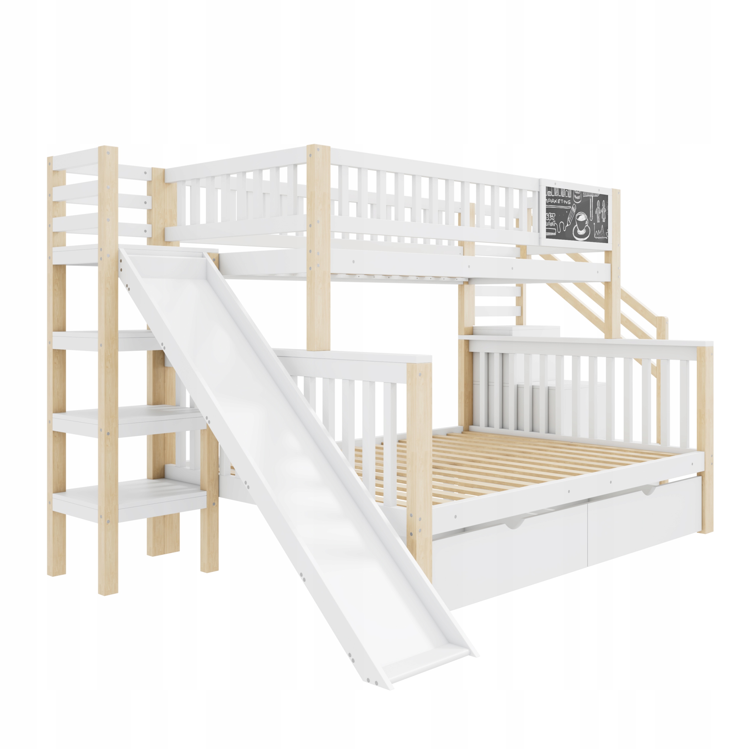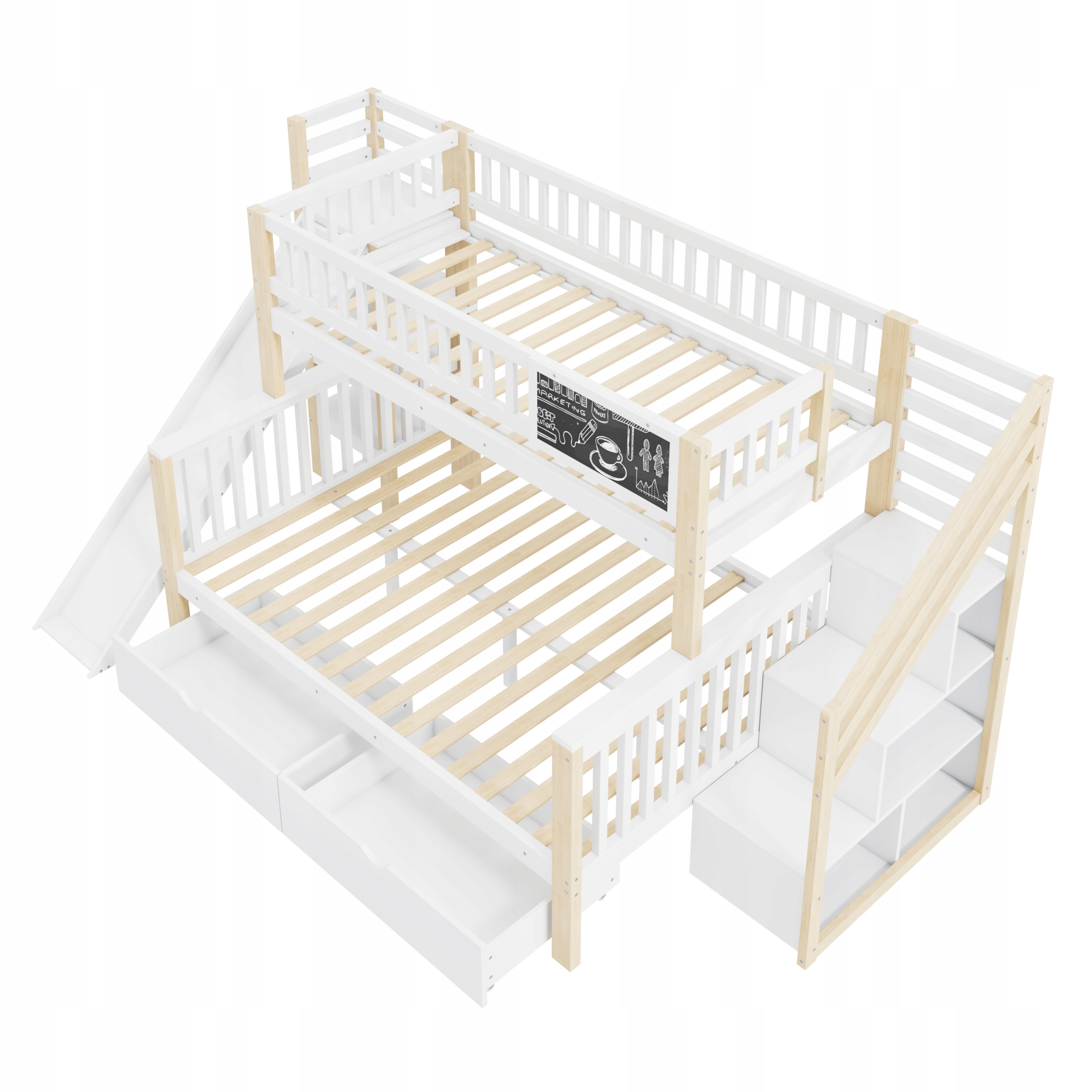 Кровать домик, детская кровать, двухъярусная кровать, с доской для граффити, многофункциональная детская кровать, с лестницей и шкафчиками, с горкой и бортиком, без матраса 140*200см и 90*200см, белая