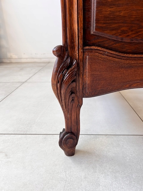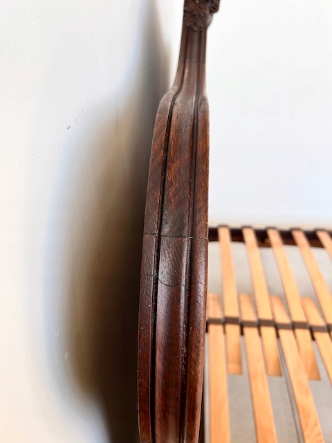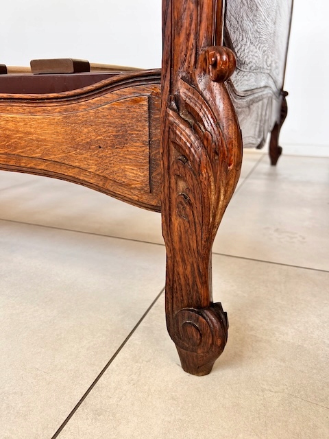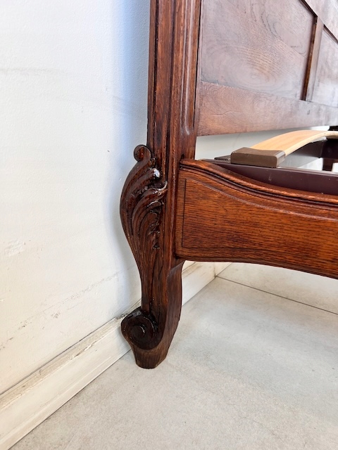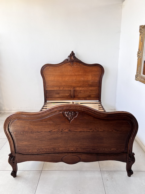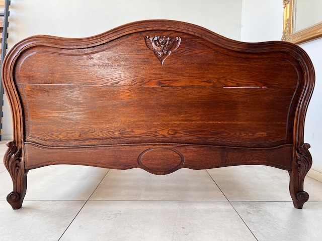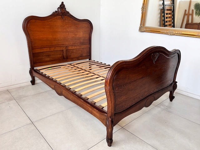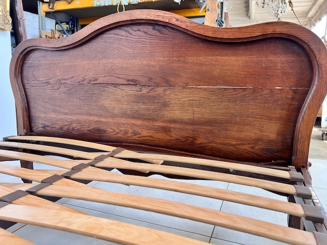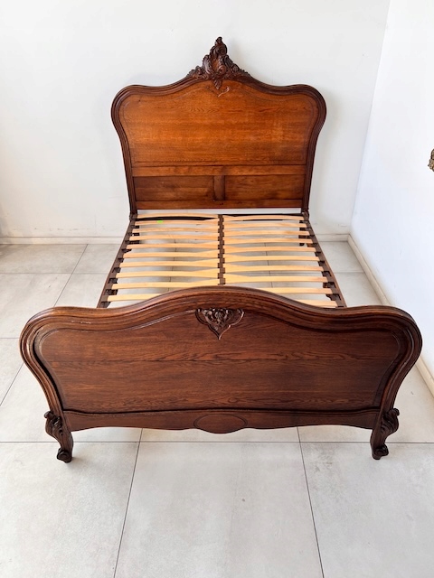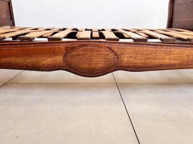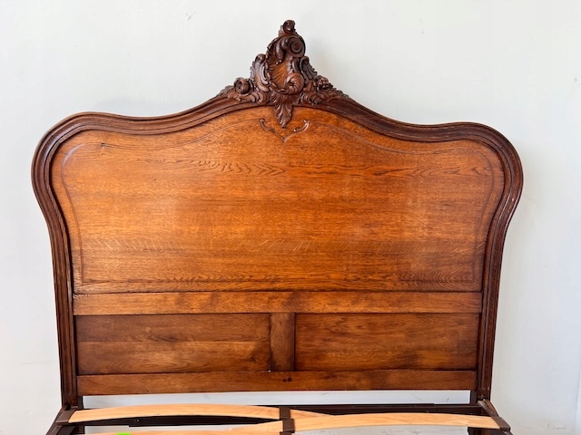 Дубовая кровать выполнена в стиле рокайль. Впечатляющий. По нашим оценкам, ему может быть около 100 лет. Он находится в хорошем состоянии. Имеет характерные следы использования. Кроме естественного высыхания лицевой панели, других повреждений и дефектов нет. Вам нужен матрас с размерами, аналогичными внутреннему размеру каркаса, например. 140 х 195 см. Кровать готова к установке.