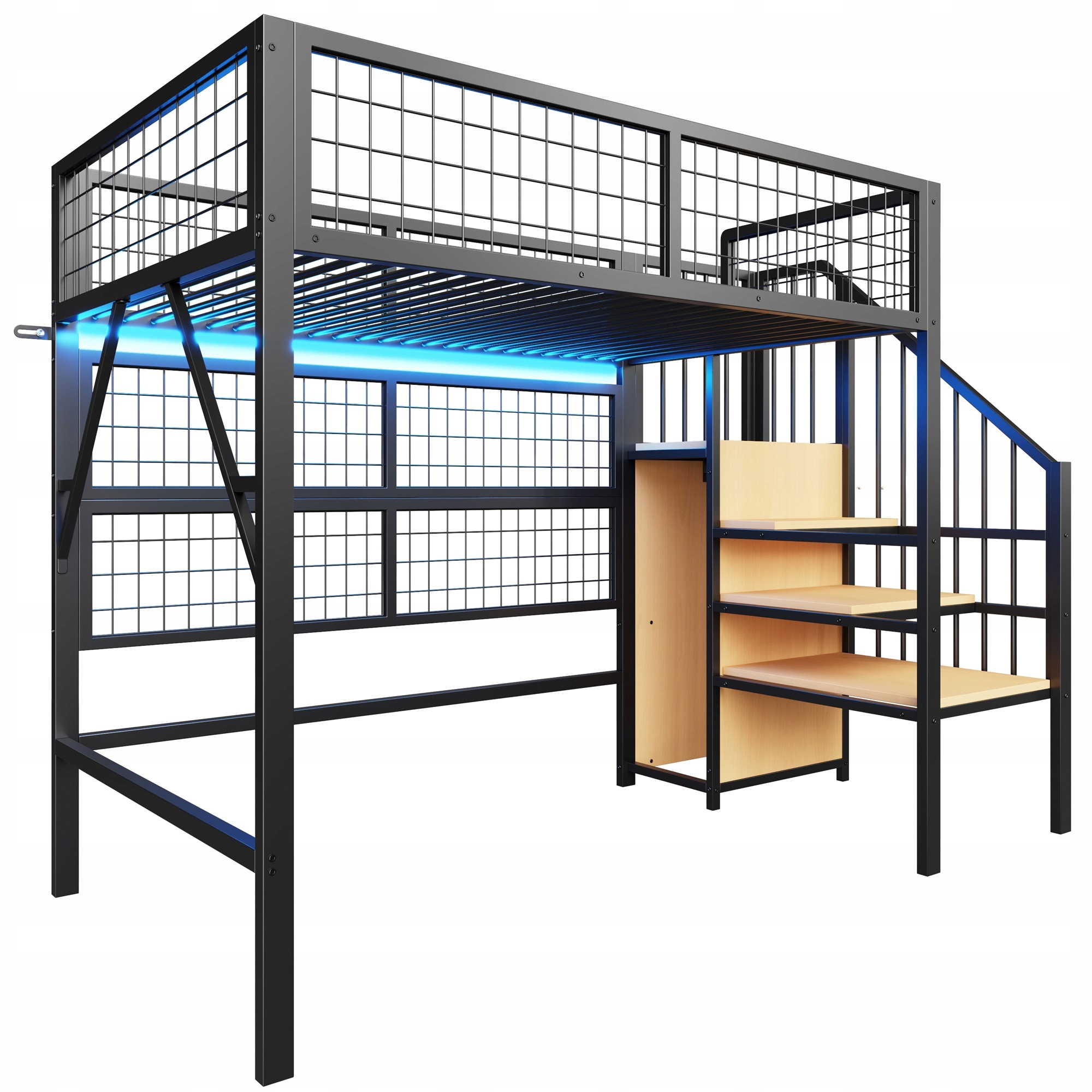 Кровать железная, двухъярусная, двухъярусная кровать 90*200, подходит для детей и подростков. Универсальная металлическая двухъярусная кровать со светодиодными лентами, управляемыми через приложение, лестницей с местом для хранения вещей, открытым шкафом, черная.