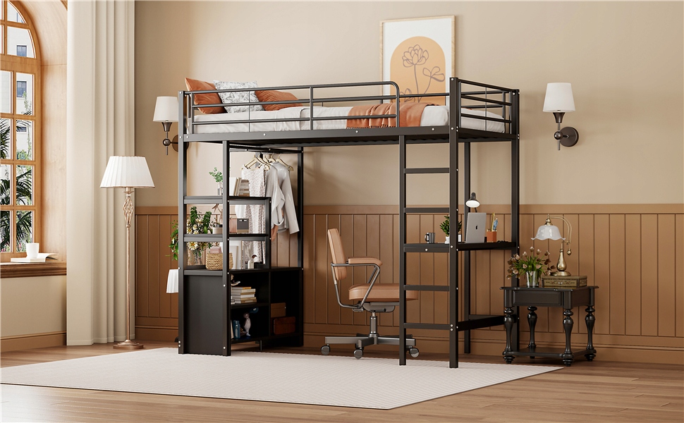 Двухъярусная кровать, 90*200 см, Без матраса, Кровать с письменным столом, С розеткой и USB, Много полок, Открытый шкаф, Балюстрада, Лестница, Железный каркас, Черный