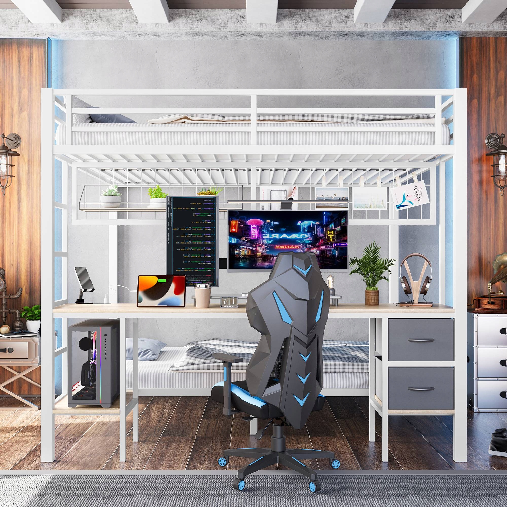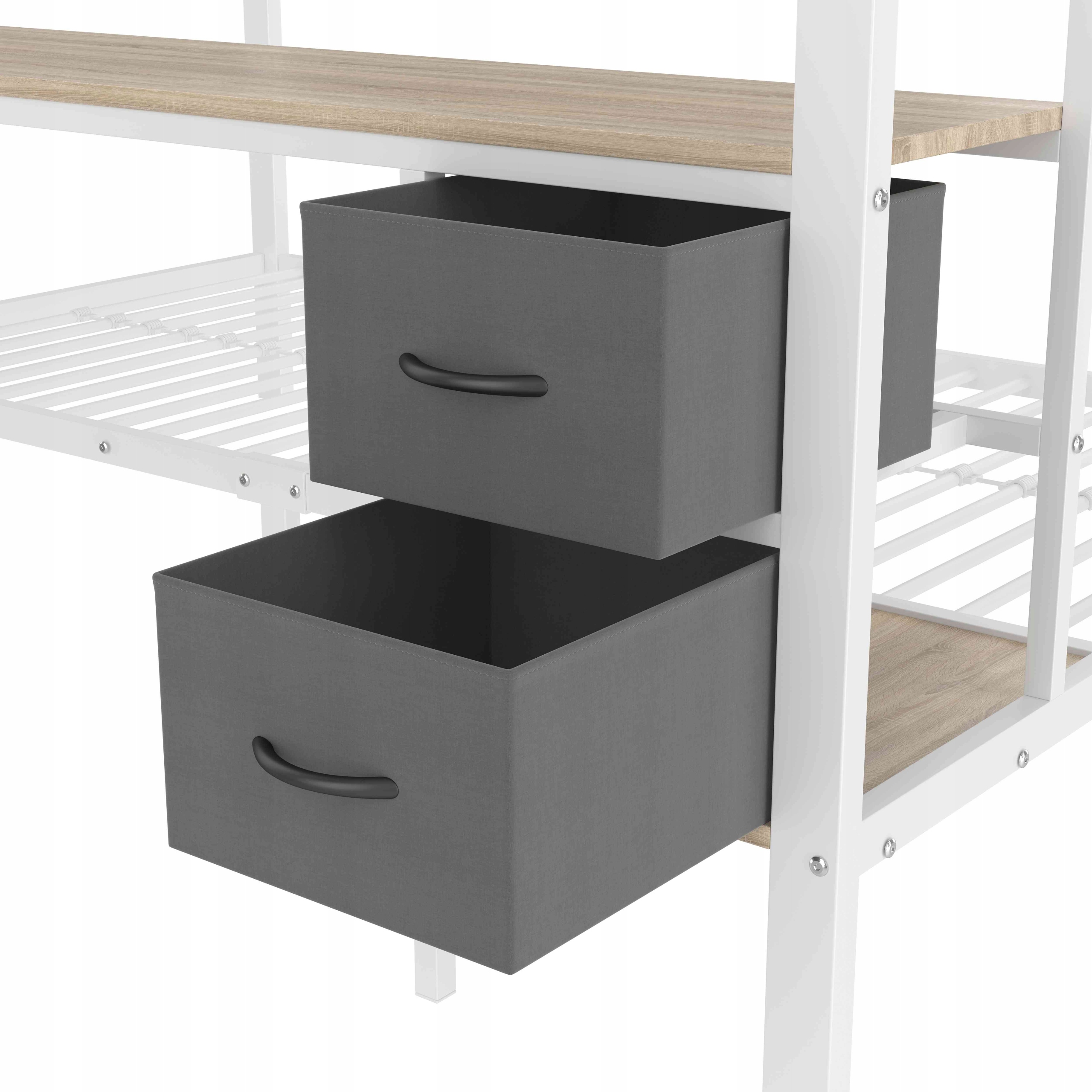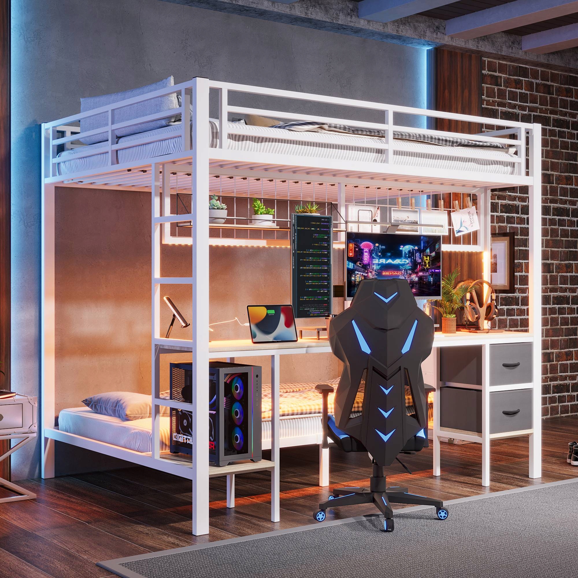 Кровать двухъярусная 90х200 и 140х200, железный каркас, выдвижные ящики, место для хранения вещей, решетка для подвешивания вещей, письменный стол, со светодиодной лентой 7 цветов, USB-порт, без матраса, Белый