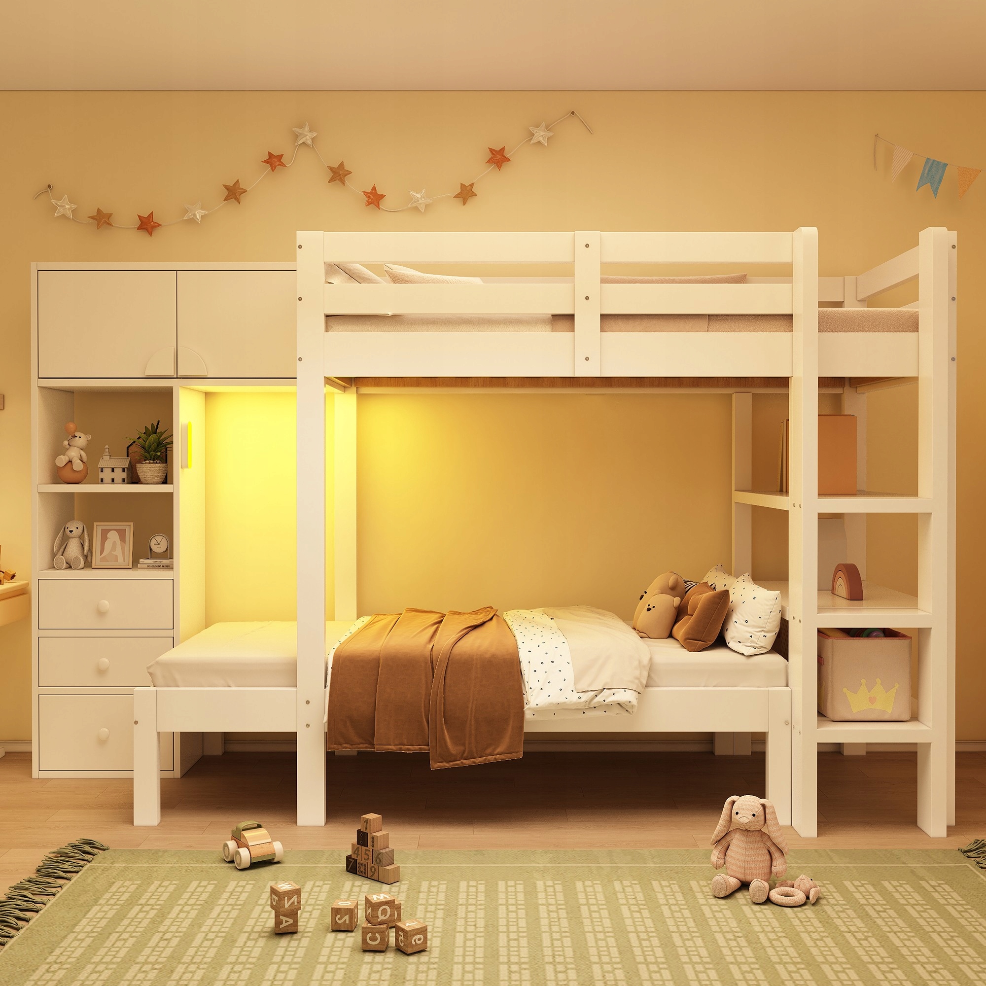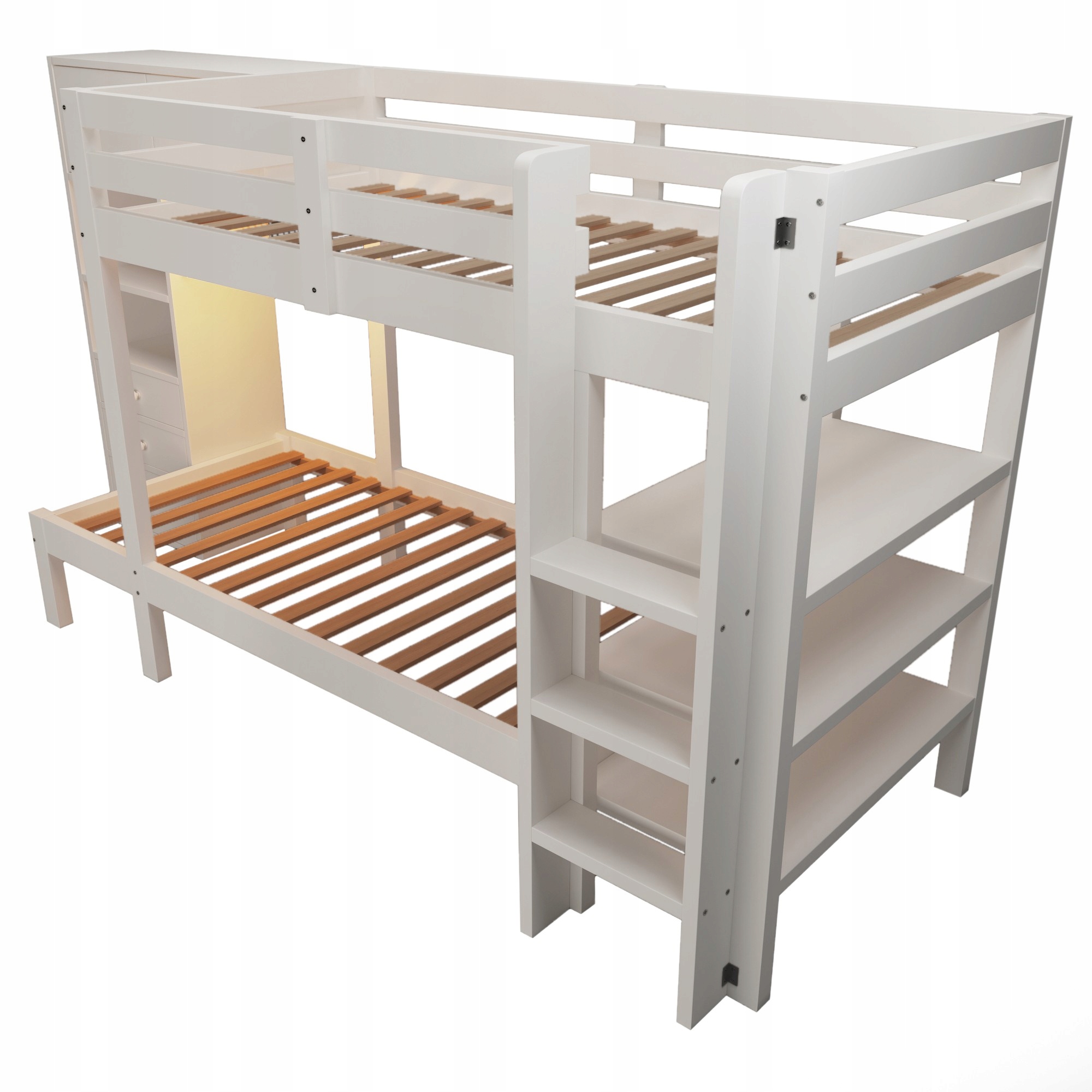 Двухъярусная кровать 90х200 см с интеллектуальным ночным освещением, смещенная конструкция со шкафом, полкой и ящиками, много места для хранения вещей, 90х200 см, белая, EN747-1:2024