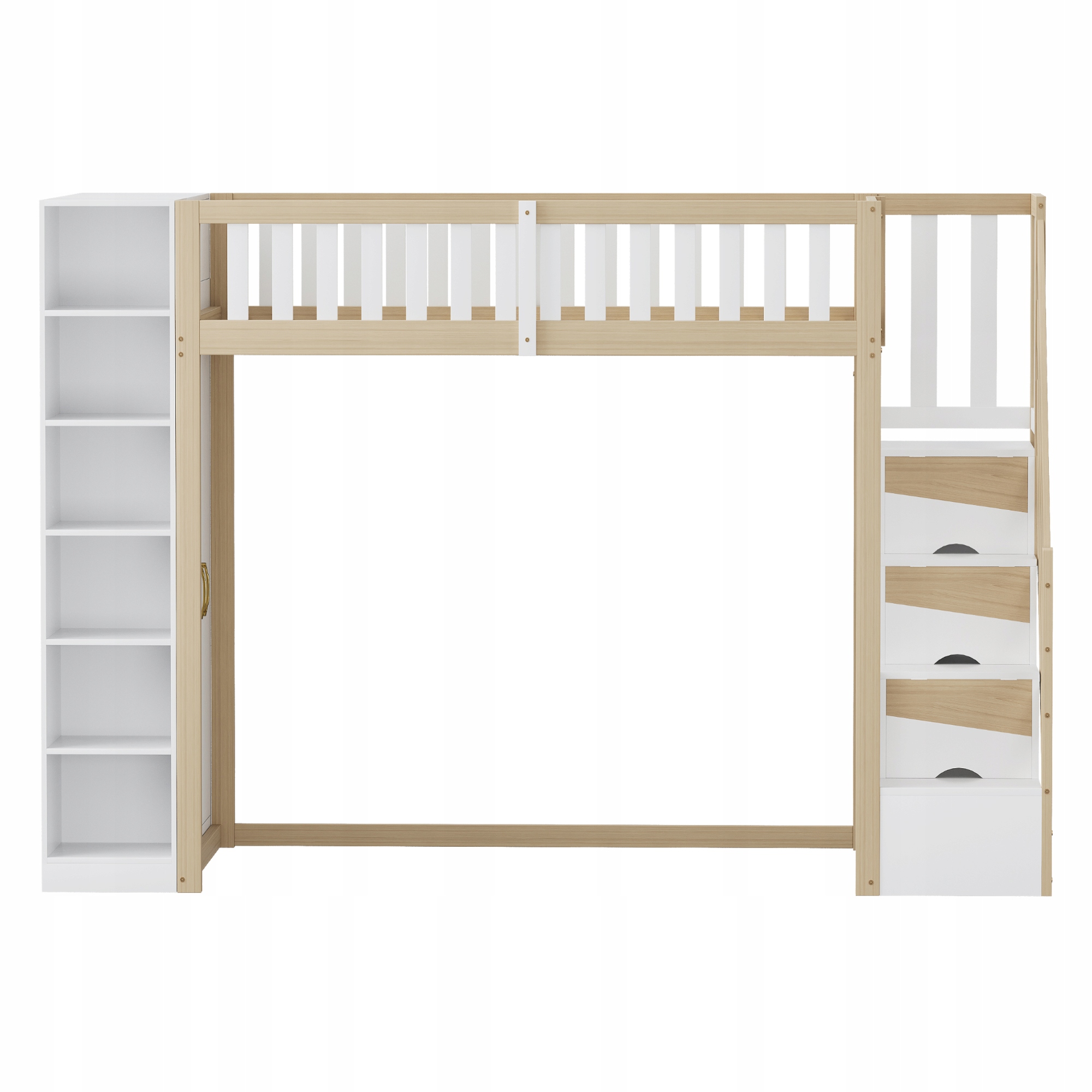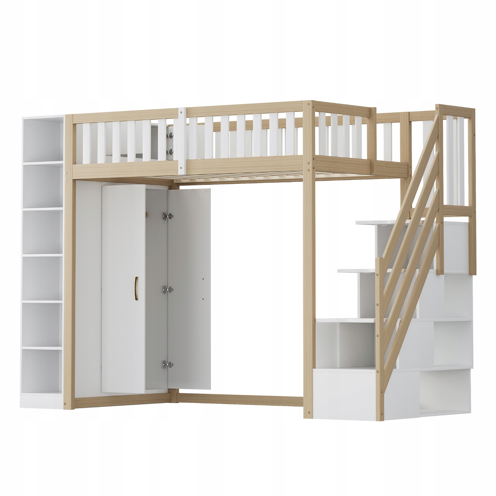Многофункциональная двухъярусная кровать 90х200 см с полками, шкафом и большим шкафом, безопасной лестницей с отделениями для хранения вещей, цвета Белый + необработанное дерево