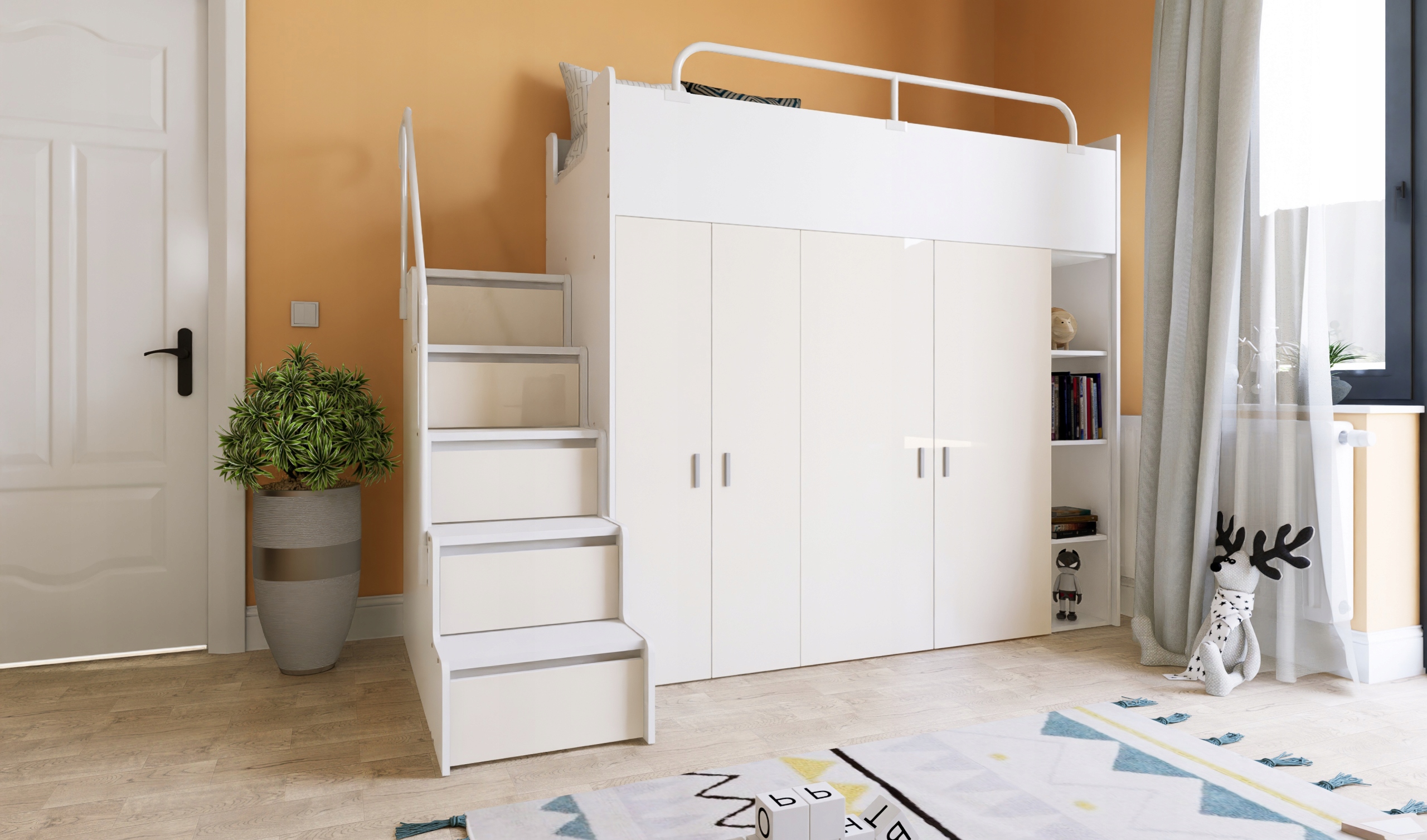 KIKI 2 MAX двухъярусная кровать 90х200 с лестницей и шкафами – белый глянец