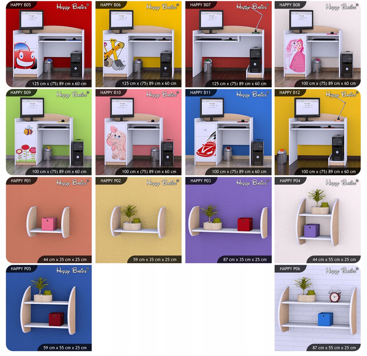 Вы можете выбрать из почти 90 моделей мебели (тумбочки, комоды для игрушек, комоды, полки, шкафы, письменные столы, полки) предназначенного для любого обустройства детской комнаты.