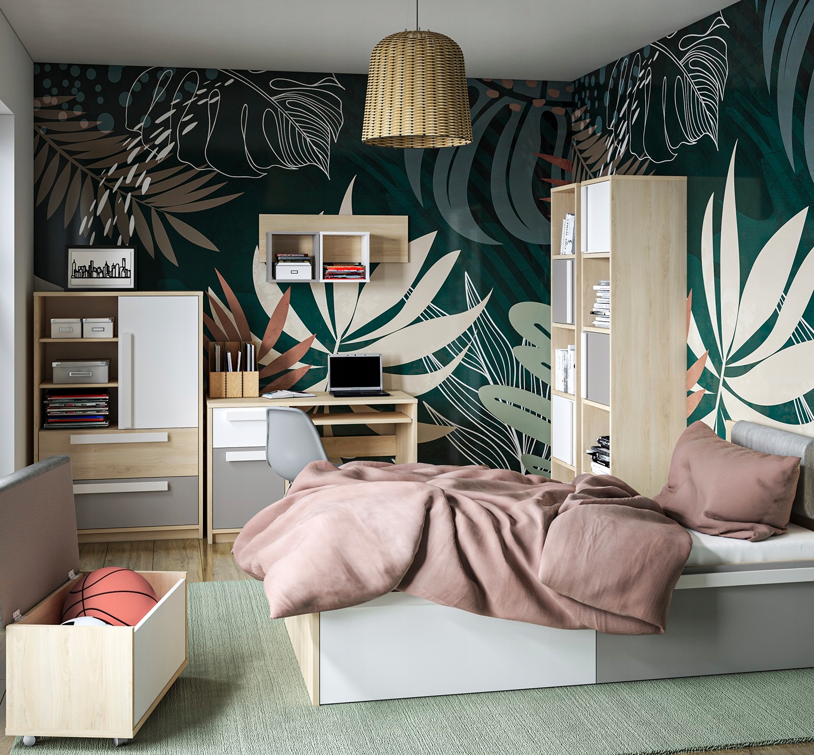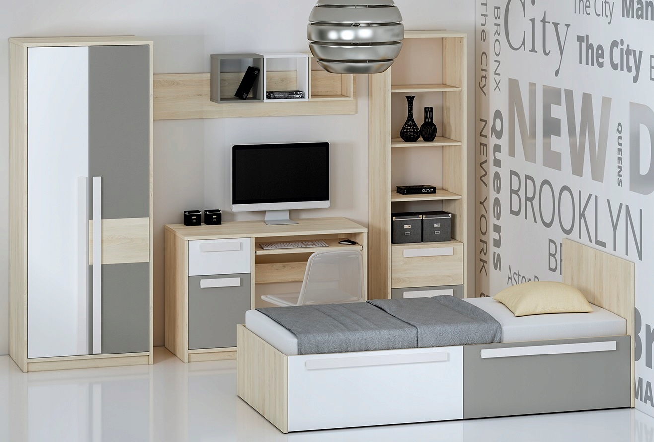 В состав системы входят: шкафы, полки, комоды, прикроватная тумбочка, кровать, письменный стол, приставка к письменному столу, комод. на колесиках, полки